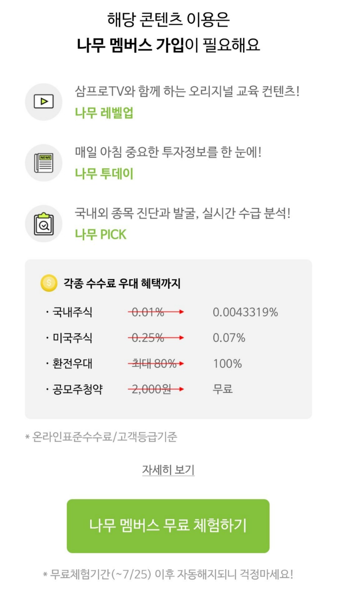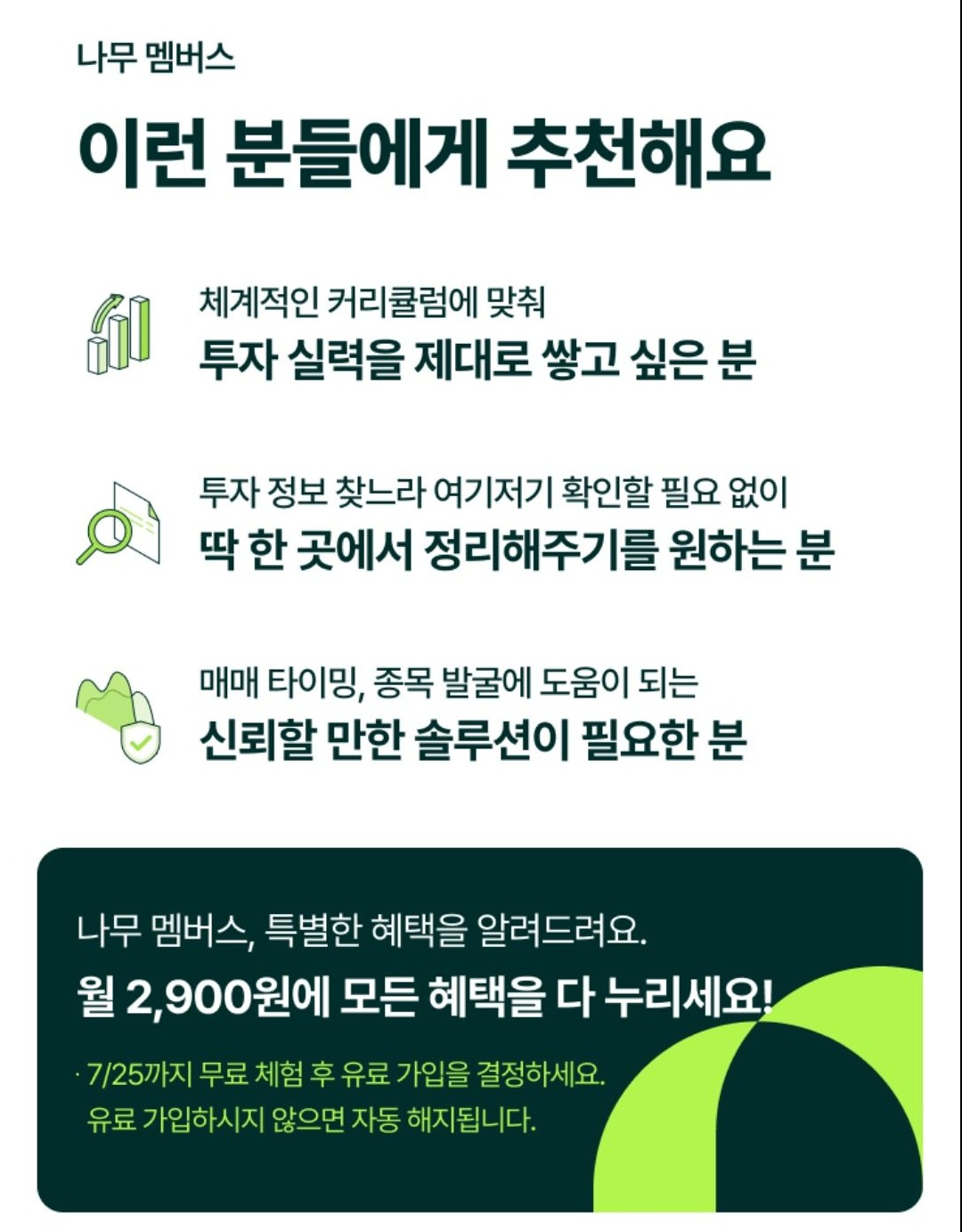 나무 멤버스는 월 구독료를 내면 수수료 혜택도 주고 주식 정보도 받아볼 수 있습니다.