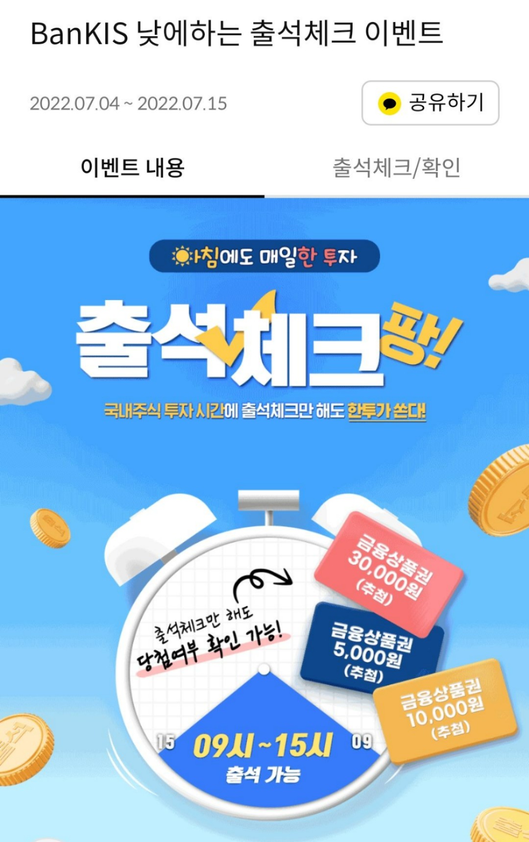 아침 9시부터 낮 3시까지 출석체크 가능한 국내주식투자 출석체크!!