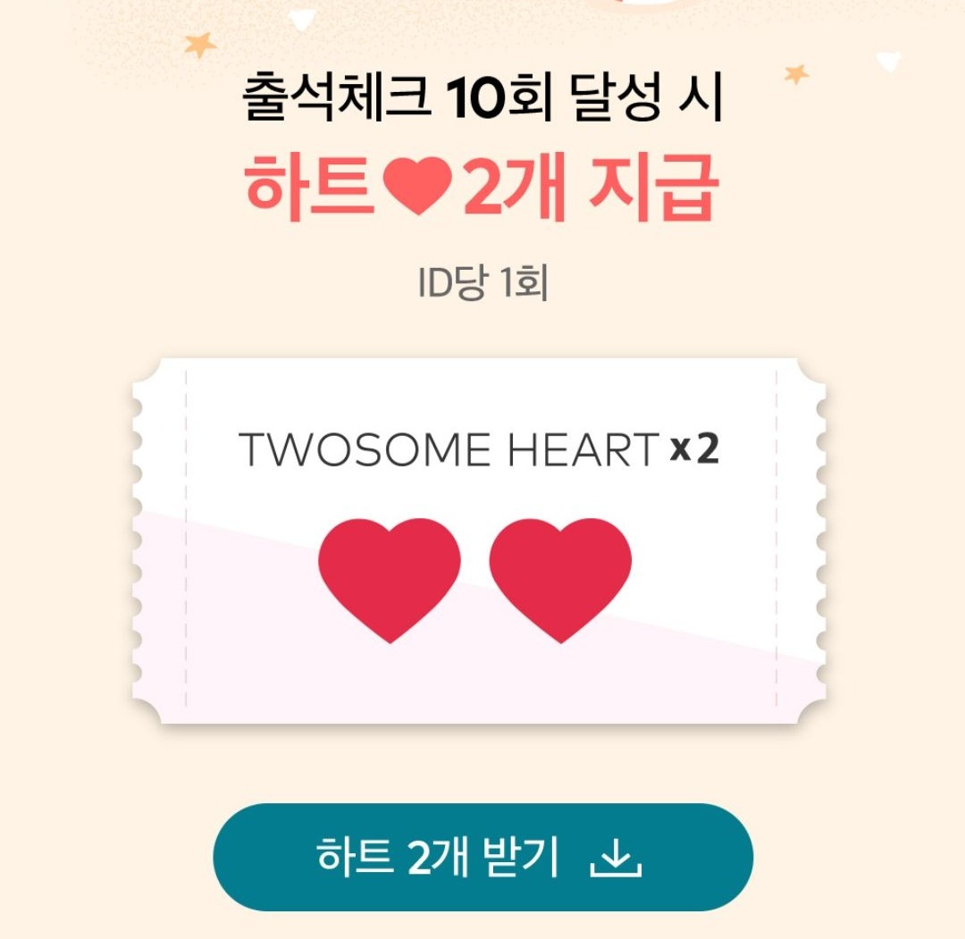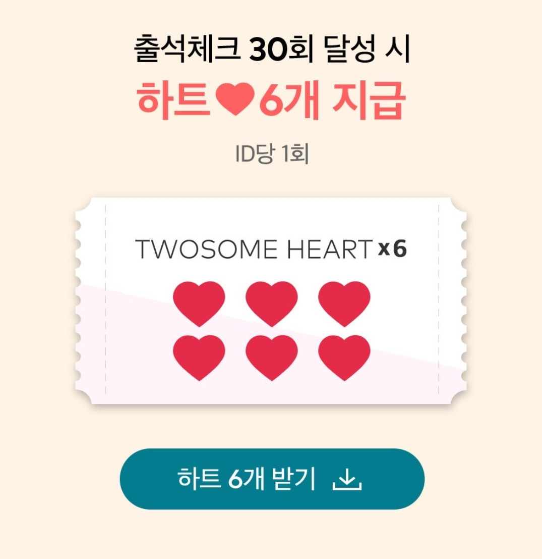 이번 달 출석체크 30일 하면 하트 6개니까 무료쿠폰 받을 수 있어요.