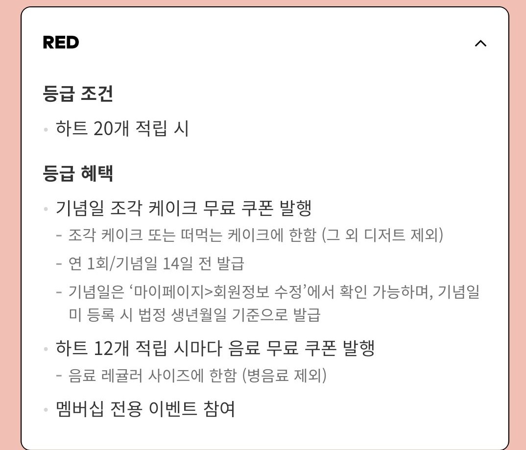 기념일 조각 케이크 무료 발행 1년에 한 번이고, 하트 12개 적립할 때마다 무료 쿠폰 발행합니다.