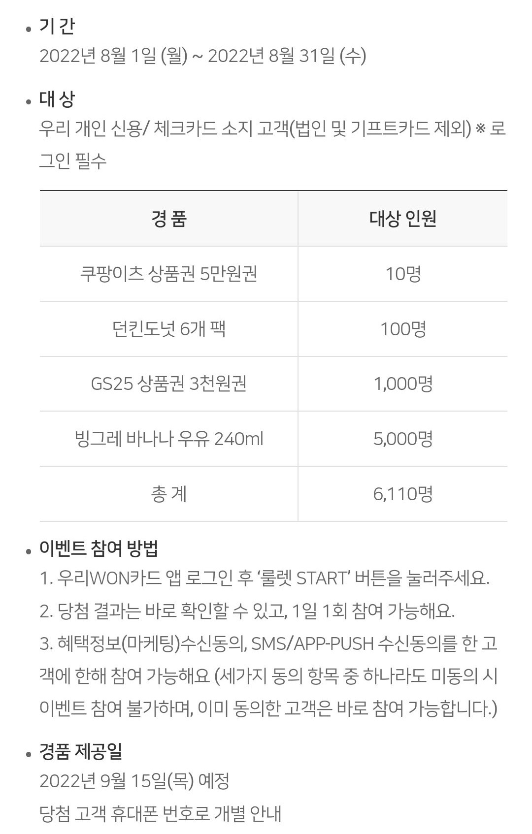 이벤트 선물 : 쿠팡이츠 상품권 5만 원 / 던킨도넛 6개 팩 / GS25 상품권 3천 원 / 빙그레 바나나 우유