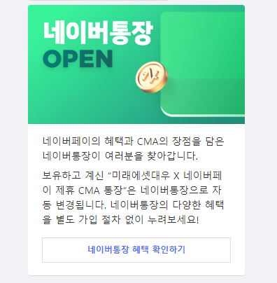 저는 기존에 네이버페이와 미래에셋대우에서 CMA를 만들면 우대금리를 주는 통장을 잘 활용하고 있었어요.