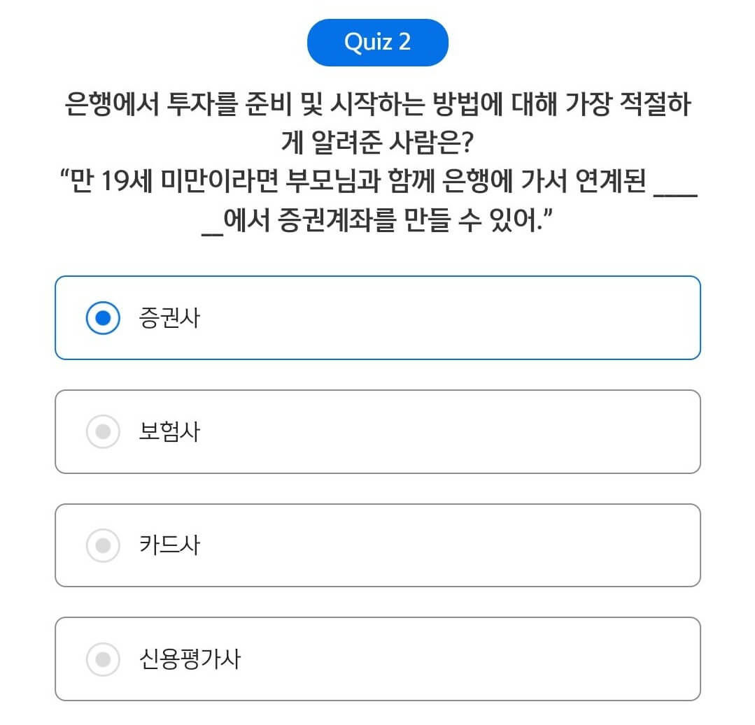 해설 : 주식과 같은 증권을 거래하는 데 꼭 필요한 증권계좌는 증권사나 은행에서 만들 수 있어요. 만 19세 미만의 자녀에게 증권계좌를 만들어주려면 부모님이 함께 창구에 방문해야 해요. 증권사 지점뿐만 아니라 각 은행에서도 연계된 증권사 계좌를 만들 수 있죠. 방문 전에 가족관계증명서, 신분증 등 필요한 서류가 무엇인지 미리 확인해야 합니다.