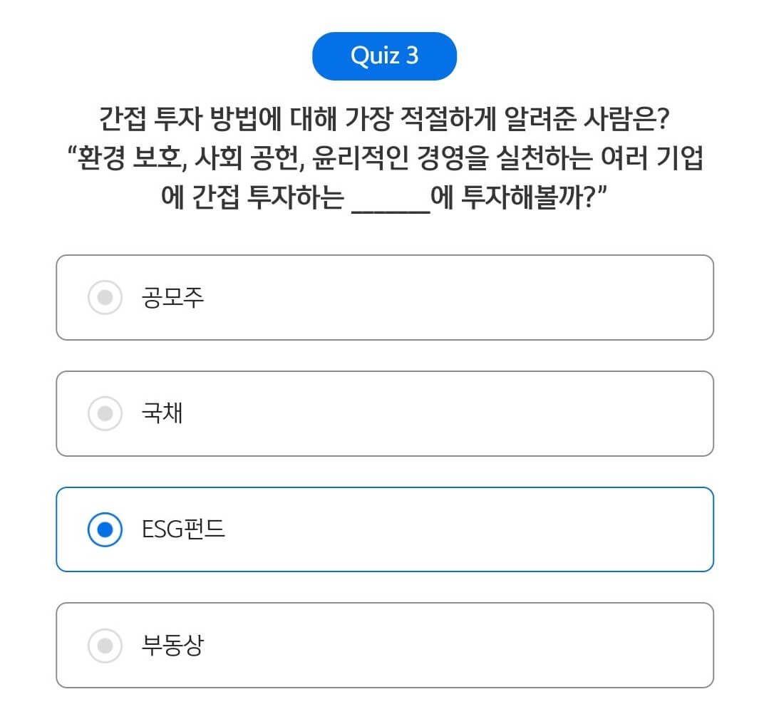 해설 : ESG는 환경(Environment), 사회(Social), 지배구조(Governance) 약자입니다. ESG투자는 친환경 제품을 만드는 기업, 사회에 공헌을 많이 하는 기업, 윤리적인 경영을 하는 기업에 투자할 수 있는 좋은 기회입니다. 꼭 관련 기업 주식에 직접 투자해야 하는 것은 아니에요. ESG펀드나 ETF를 활용하면 글로벌 청정에너지, 전기차 기업을 비롯해 국내 ESG 우수 실천 기업 주식과 채권에 간접투자할 수 있어요. 단, ESG 관련 기업은 장기적인 관점으로 접근해야 합니다.