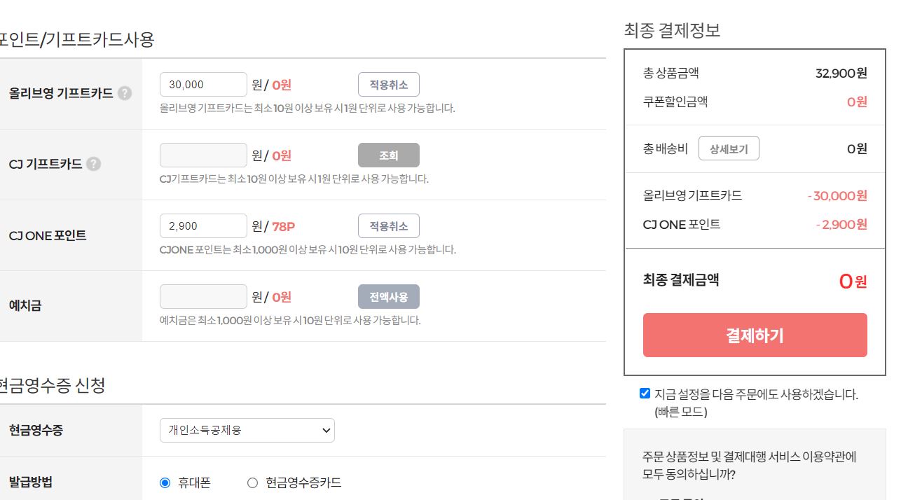 올리브영 기프트카드 3만 원 사용하고, CJ ONE 포인트 2,900점 사용해서 최종 결제 금액은 0원입니다. 기프트카드는 현금영수증 발급도 가능하니까 잊지 말고 신청하세요.