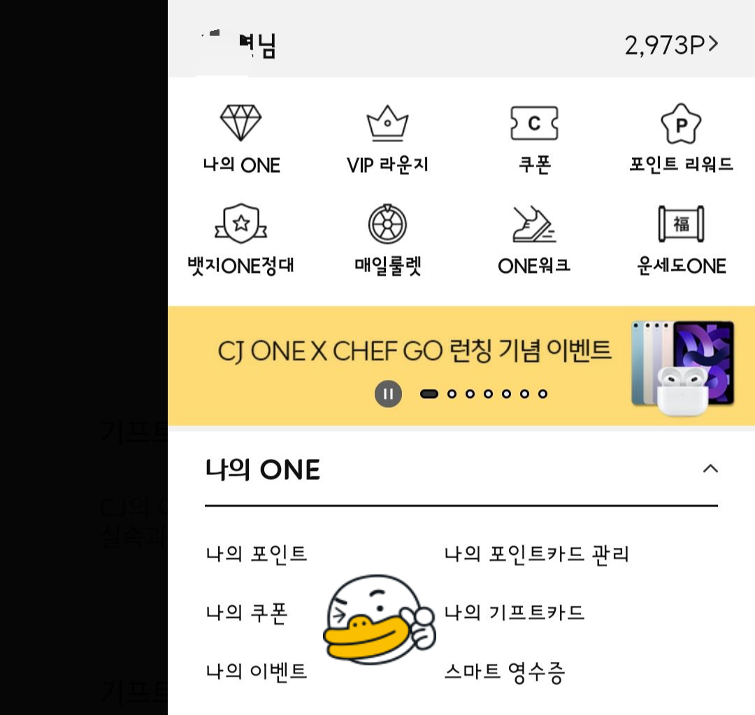 CJ원 어플 > 오른쪽 상단 메뉴 > 나의 기프트카드
