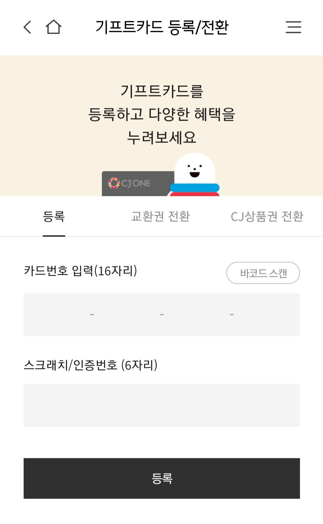 - 최대 15개까지 등록 가능하며, 등록된 기프트카드는 CJ ONE 멤버십 적립카드로도 사용 가능합니다.