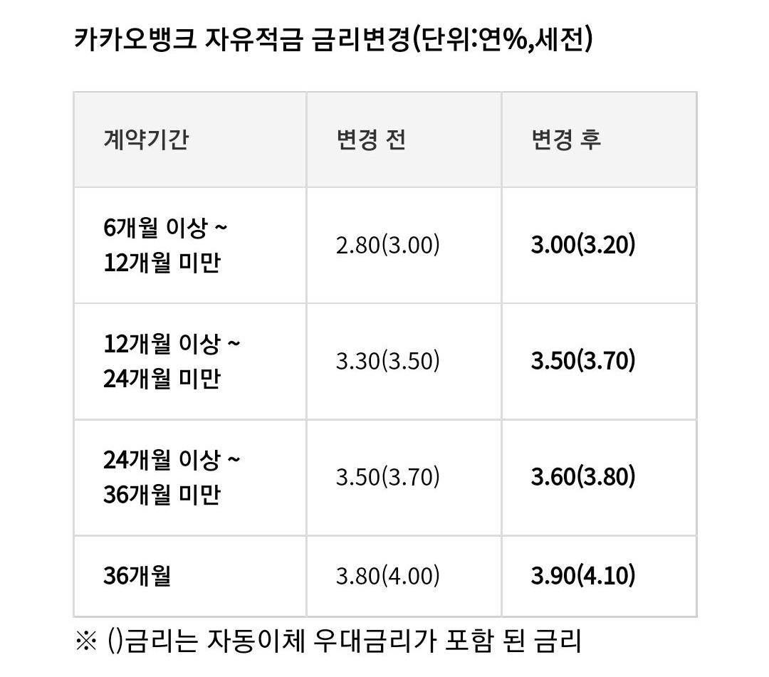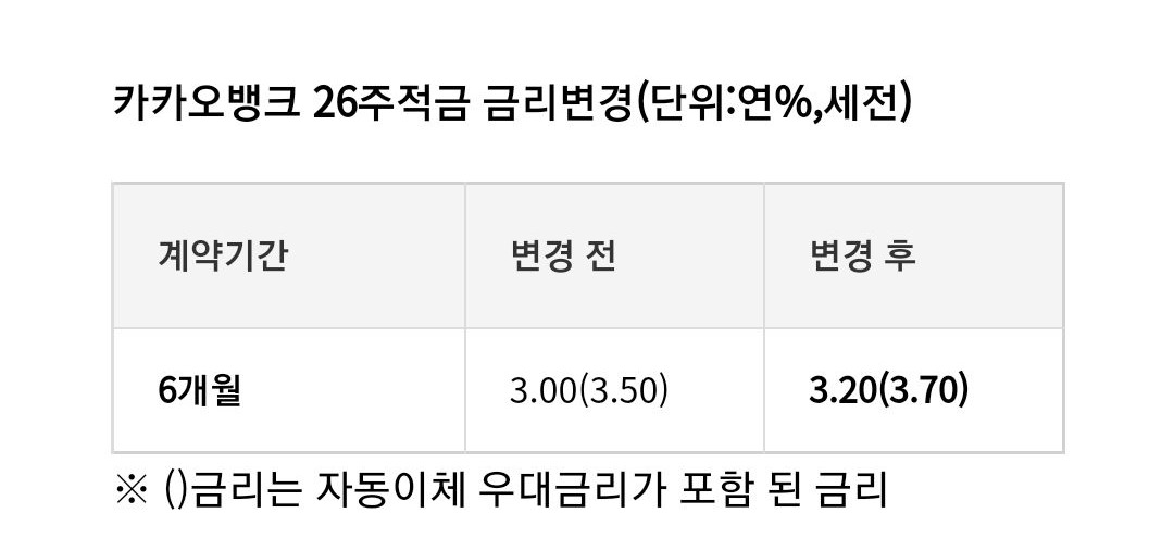 카카오뱅크 26주 적금 금리도 인상되어 최대 연 3.70% 금리가 적용됩니다. 최고 금리 받기 위해서는 자동이체를 걸어두면 0.5%p를 받을 수 있습니다. 정기예금 1년 만기는 연 3.30%, 1년 자유적금은 최고 연 3.7%, 3년 만기 자유적금은 최고 연 4.1% 금리 제공해요. 오늘부터 가입한 금융상품만 대상이니까 만약 어제 가입했다면 과감하게 해지하고 새로 가입하세요. 1년 만기 기준으로 0.2%p 차이니까 귀찮다고 그냥 놔둘 필요는 없습니다.