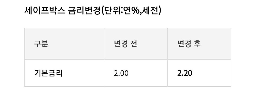 너도나도 금리를 올리고 있는데, 카카오뱅크는 줄곧 연 2.00% 고집했는데요. 드디어 세이프박스가 연 2.20%로 0.20%p 인상했습니다. 오늘부터 파킹통장 세이프박스 기본금리도 변경됩니다. 토스뱅크를 쓸 이유가 점점 더 사라지고 있네요!!