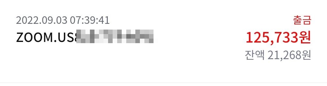 결제는 해외 결제 가능한 카드로 하면 됩니다. 저는 해외 결제 시 수수료 캐시백 받는 카드로 사용하고 있어요. 125,733원 결제되었습니다. 한 달에 1만 원 비용이라고 생각하면 되겠네요. ZOOM으로 1만 원 이상 더 벌기!!!