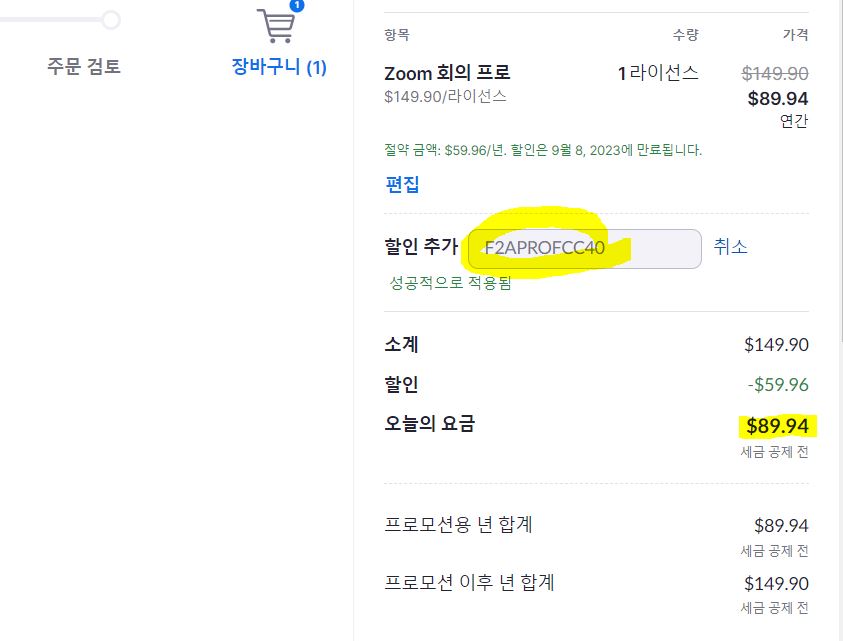 해지도 안 되고, 결제만 가능한가봐요. 탈퇴하려면 미결제 청구서가 있어서 ZOOM에 이메일 보내야 해요. 일단 보내 놨는데 답변 오면 알려드릴게요. 아무튼 미루고 미루다가 9월 첫 번째 모임 하루 전 날, 결국 1,363.00원에 결제했습니다. 물론 164.89$를 내지 않았고요 40% 할인받았습니다. 오늘은 ZOOM 요금제 할인받아 결제하는 방법에 대해 공유하겠습니다.