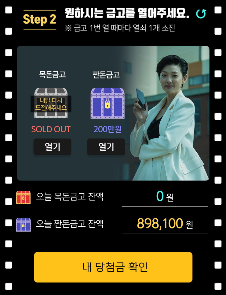 열쇠를 받고 목돈금고 또는 짠돈금고를 눌러 당첨금을 확인합니다.