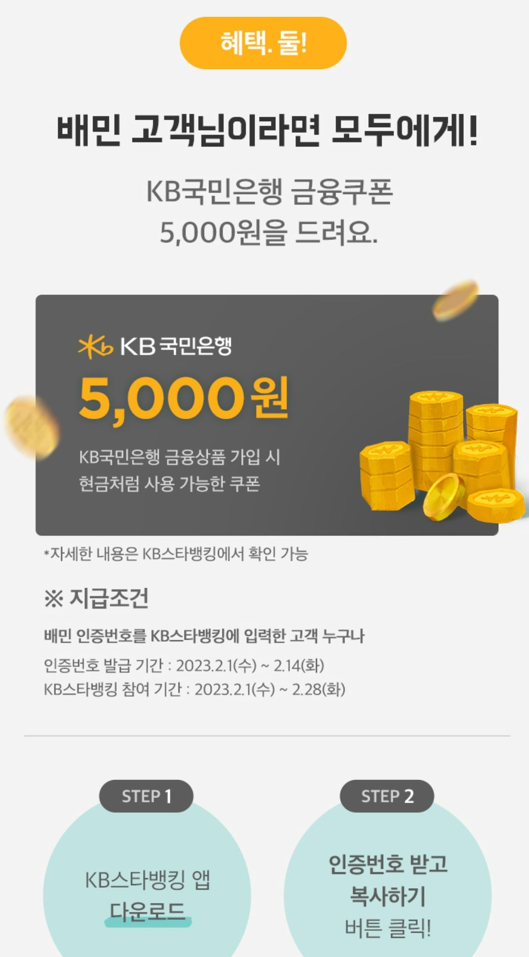 하단 링크는 KB스타뱅킹에서 진행하는 이벤트 페이지입니다. 배달의민족 쿠폰 번호 복사 후 하단 링크 눌러서 등록하세요. 모바일로 접속해야 바로 이벤트 페이지로 이동합니다.