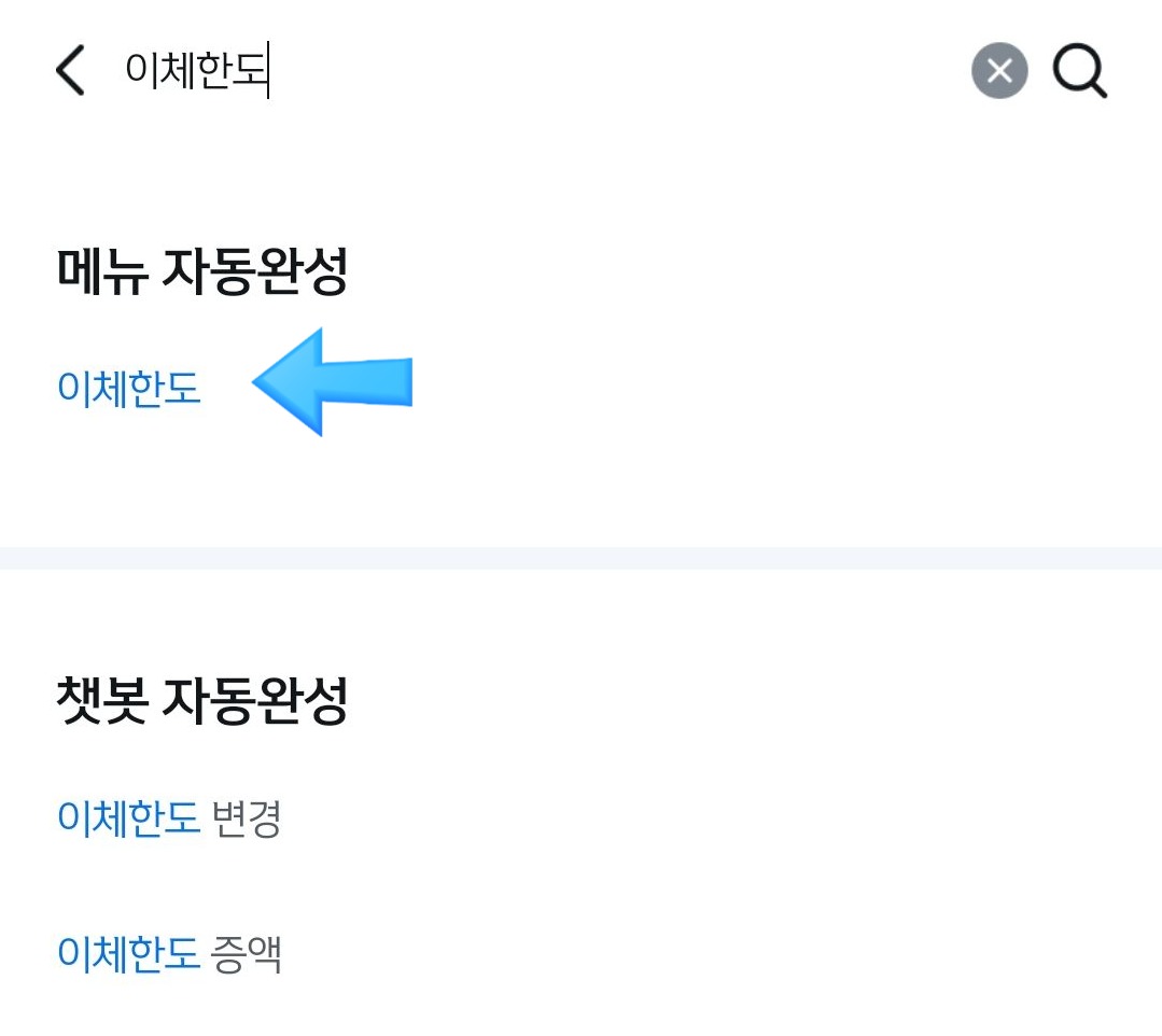 여기서 메뉴와 챗봇이 나오는데요. 메뉴 > 이체한도 누르면 현재 본인 이체한도와 보안매체별 최대 이체한도를 확인할 수 있습니다.