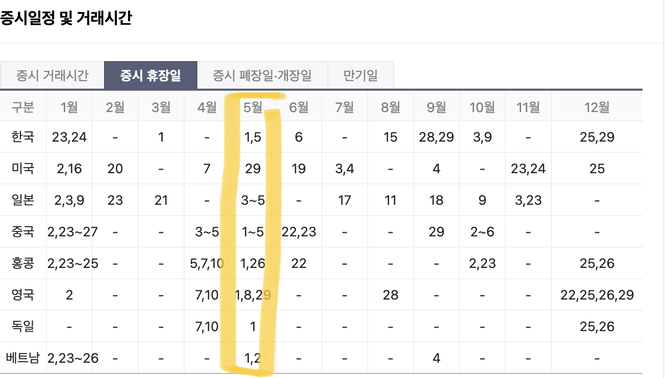 한국은 1일 근로자의 날, 어린이날 휴장입니다. 8일 어버이날은 정상적으로 주식시장 개장해요. 미국 증시는 29일, 일본 증시는 3~5일, 중국 증시는 1일부터 5일까지 휴장일입니다.