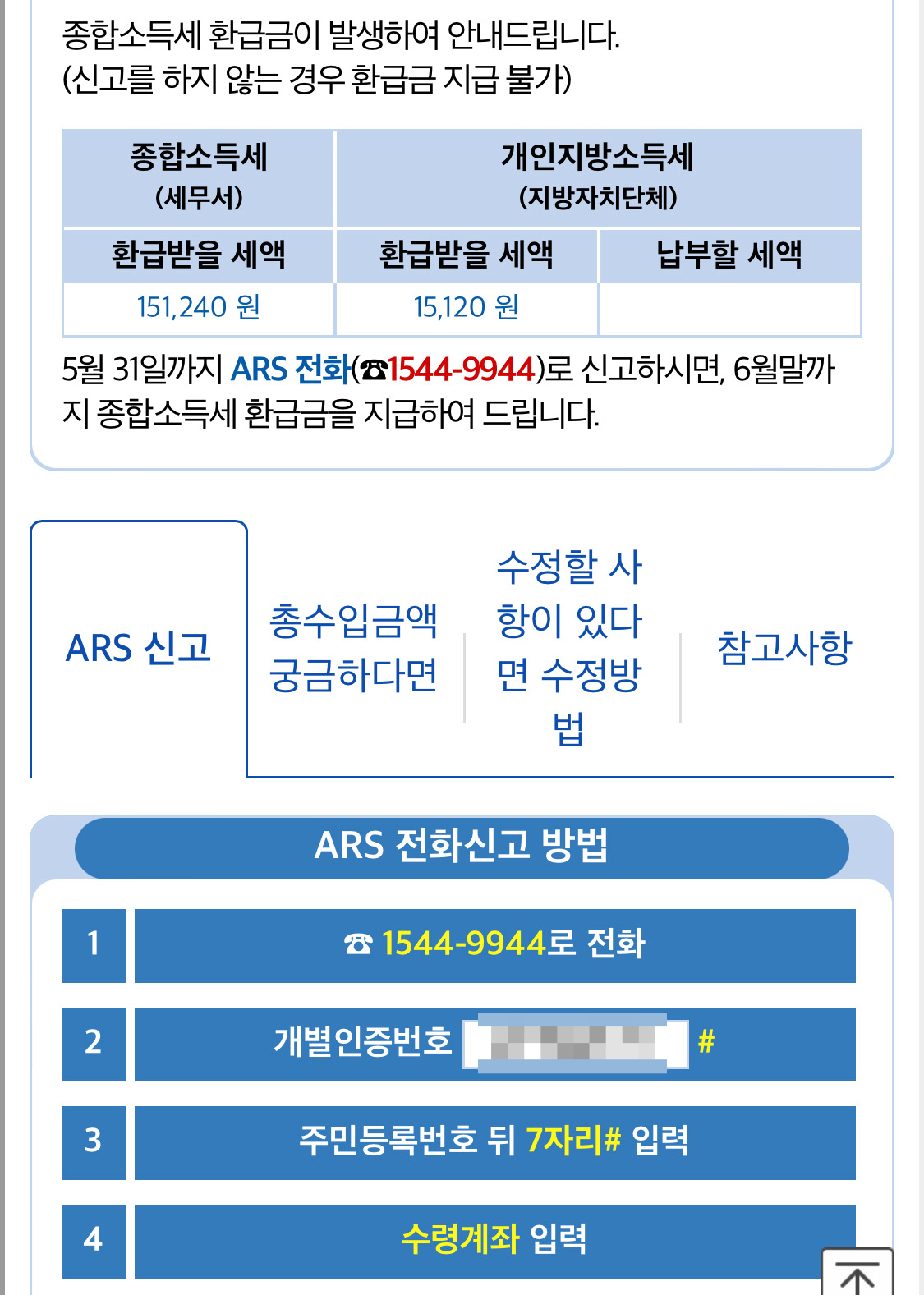 5월 31일까지 ARS전화 1544-9944로 신고하면 6월 말까지 종합소득세 환급금을 지급해 줍니다. 신고하지 않으면 환급금 지급 불가하므로 바로 신청하세요!!