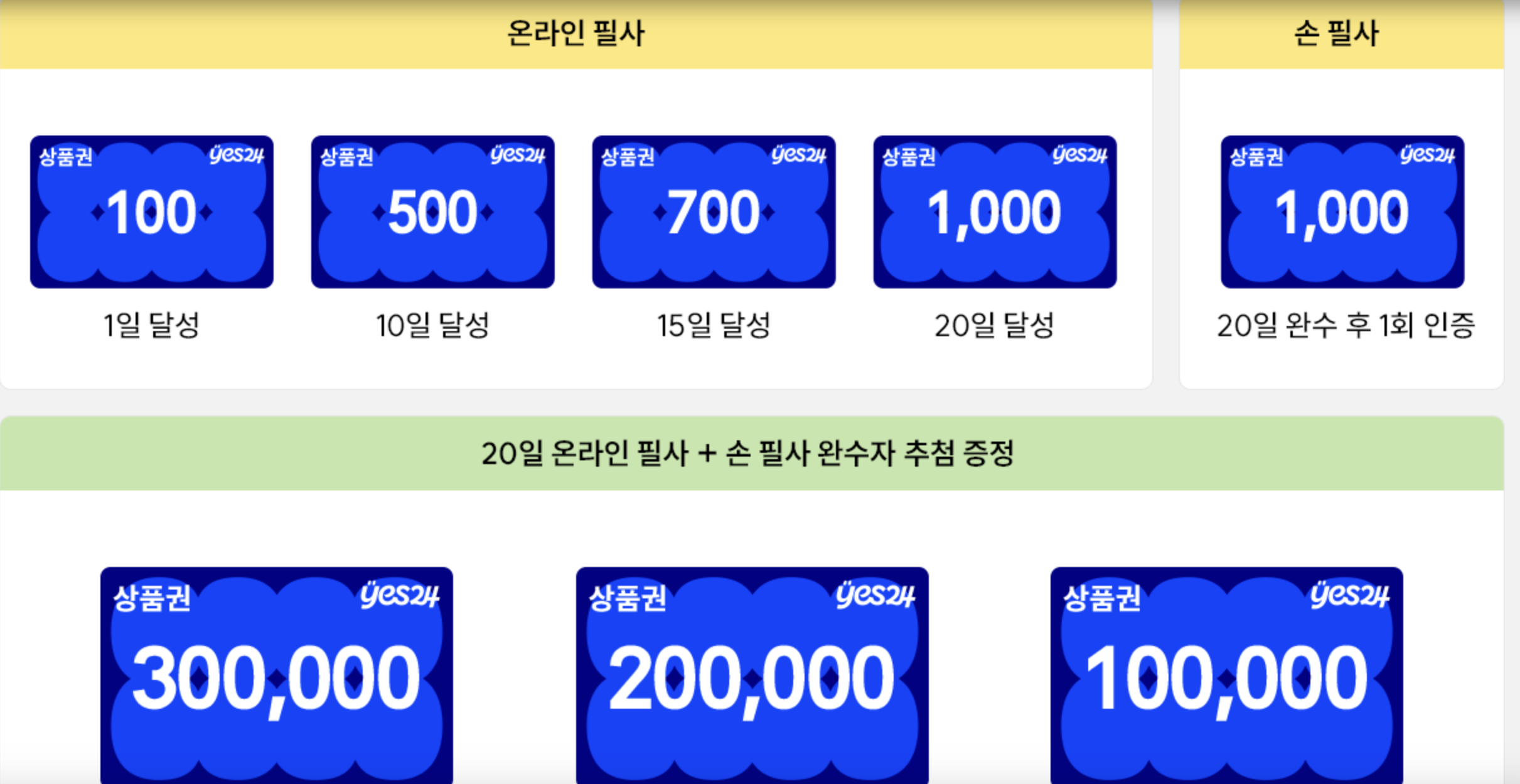 읽은 부분 중에서 문장을 꼽아 50자 이상 적어서 등록하면 되는 것이라 종이책 뿐만 아니라 e북으로 읽어도 됩니다. 또한 매일 인증하지 않고 기간 안에 20회 인증하면 2,300점 받을 수 있고요. 1회만 손필사 인증하면 1,000점 추가로 얹어서 3,300점이 들어옵니다.