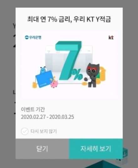 3월 매주 월요일 아침 10시부터 판매하며 총 4번, KT 1020 고객 대상으로 우리은행 고금리 7% 적금, 우리 KT Y적금을 판매하고 있어요.