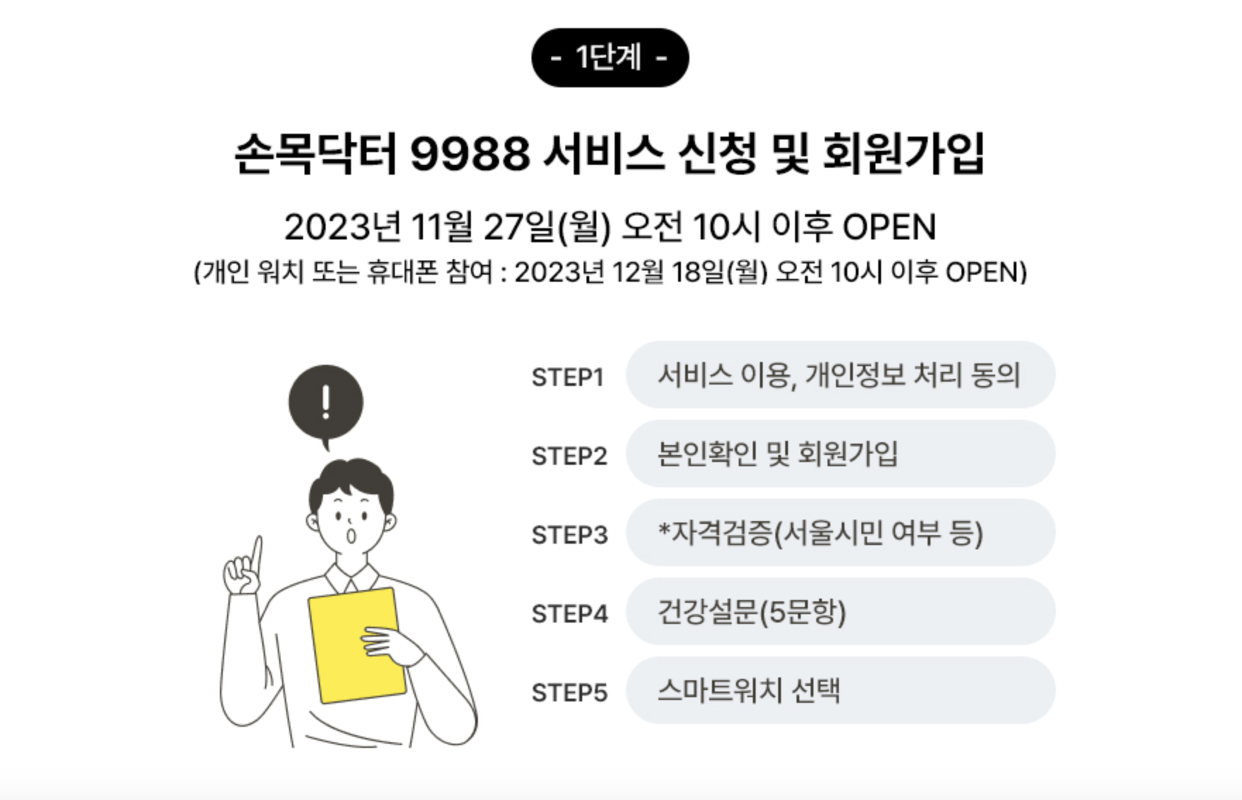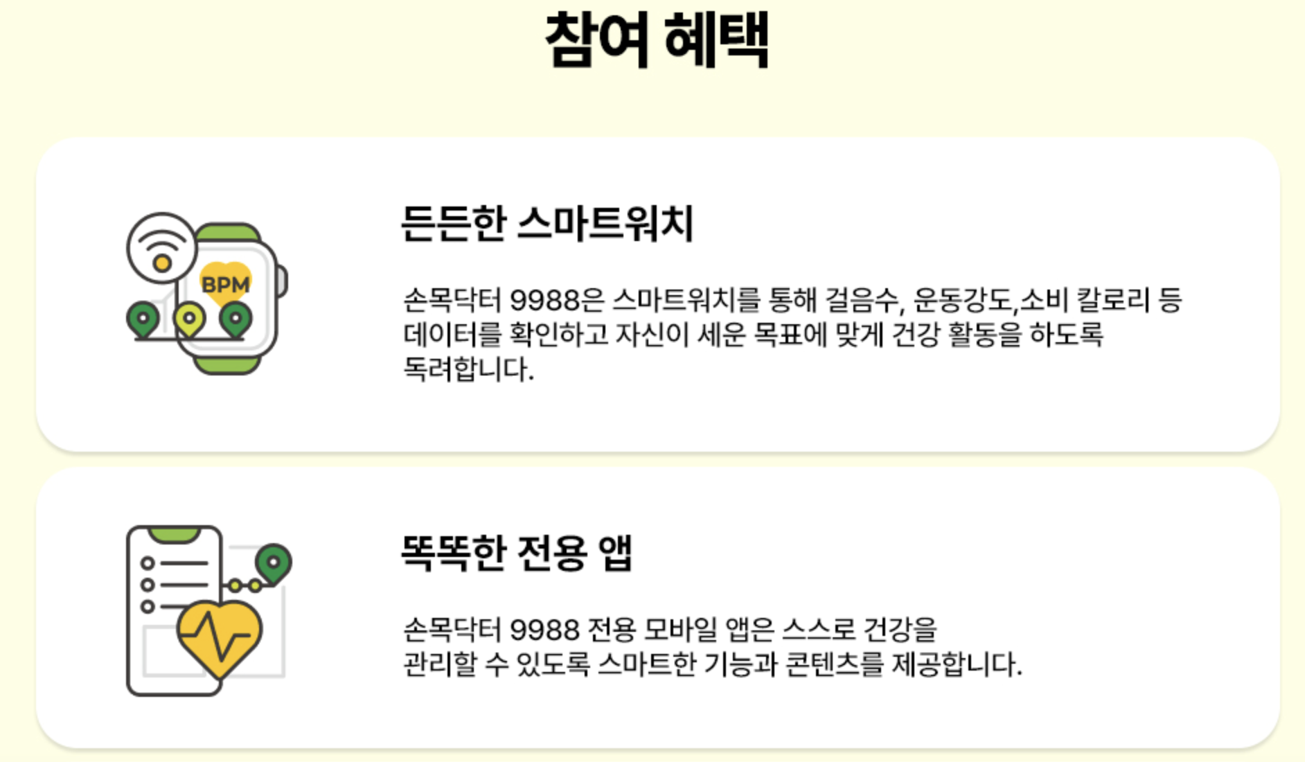 11월 27일 월요일 아침 10시부터 손목닥터 9988 신청기간입니다. 요즘 손목닥터 경쟁률이 장난 아니라고 하더라고요. 제가 했을 때만 해도 그나마 하루동안 신청 가능했는데 말이죠. 오늘부터는 스마트워치 택배 수령하는 분들 신청이고요. 저처럼 개인 워치 또는 휴대폰으로 참여할 분은 12월 18일 월요일 아침 10시부터 모집합니다.