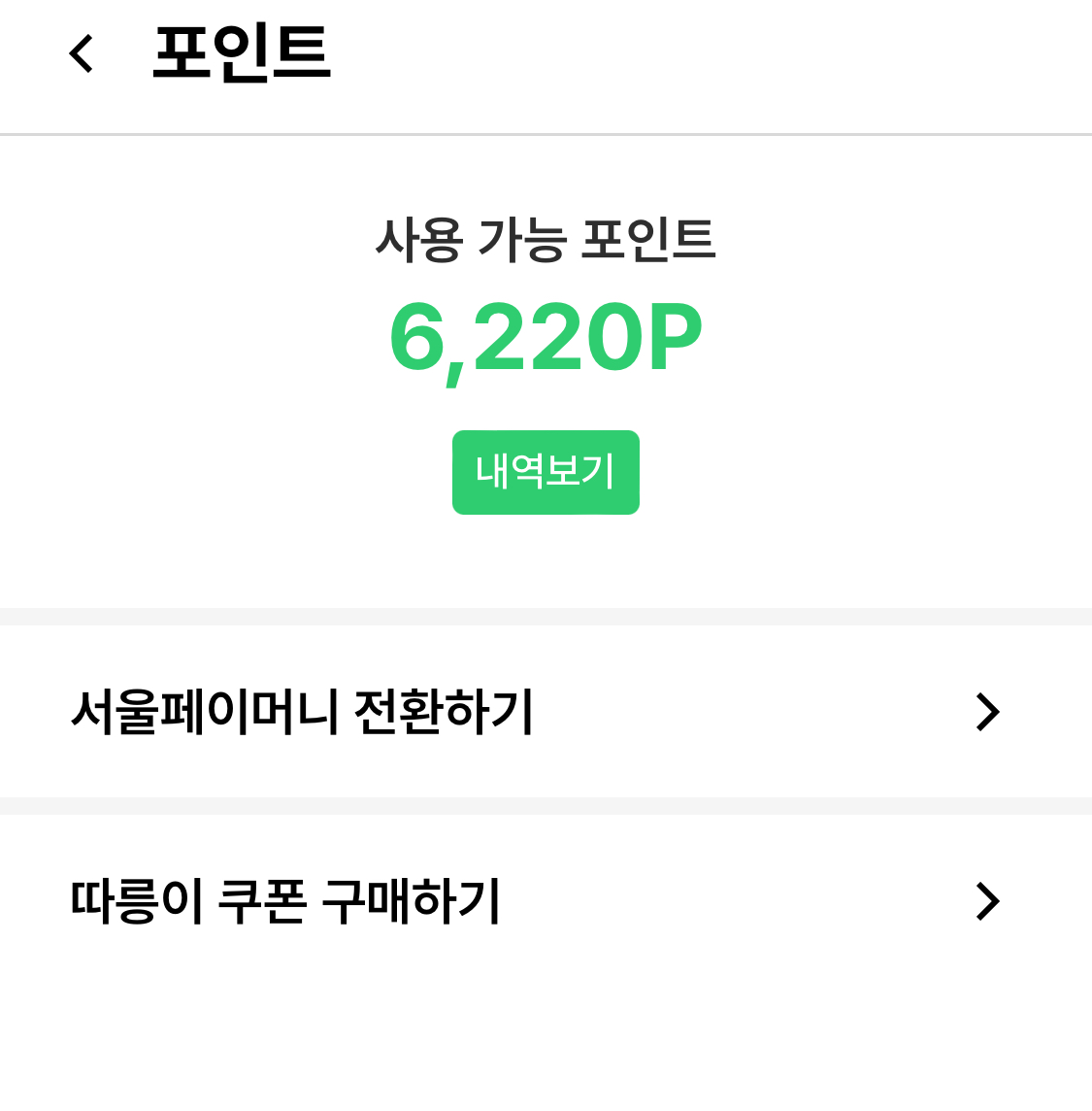 손목닥터9988 메인 화면에서 포인트를 누르면 오른쪽 화면처럼 사용 가능 포인트를 확인할 수 있어요. 저는 6,220점 모았습니다. 서울페이머니로 전환 가능하고 따릉이 쿠폰 구매하기도 가능합니다. 저는 서울페이머니 전환하기 버튼을 눌렀어요.