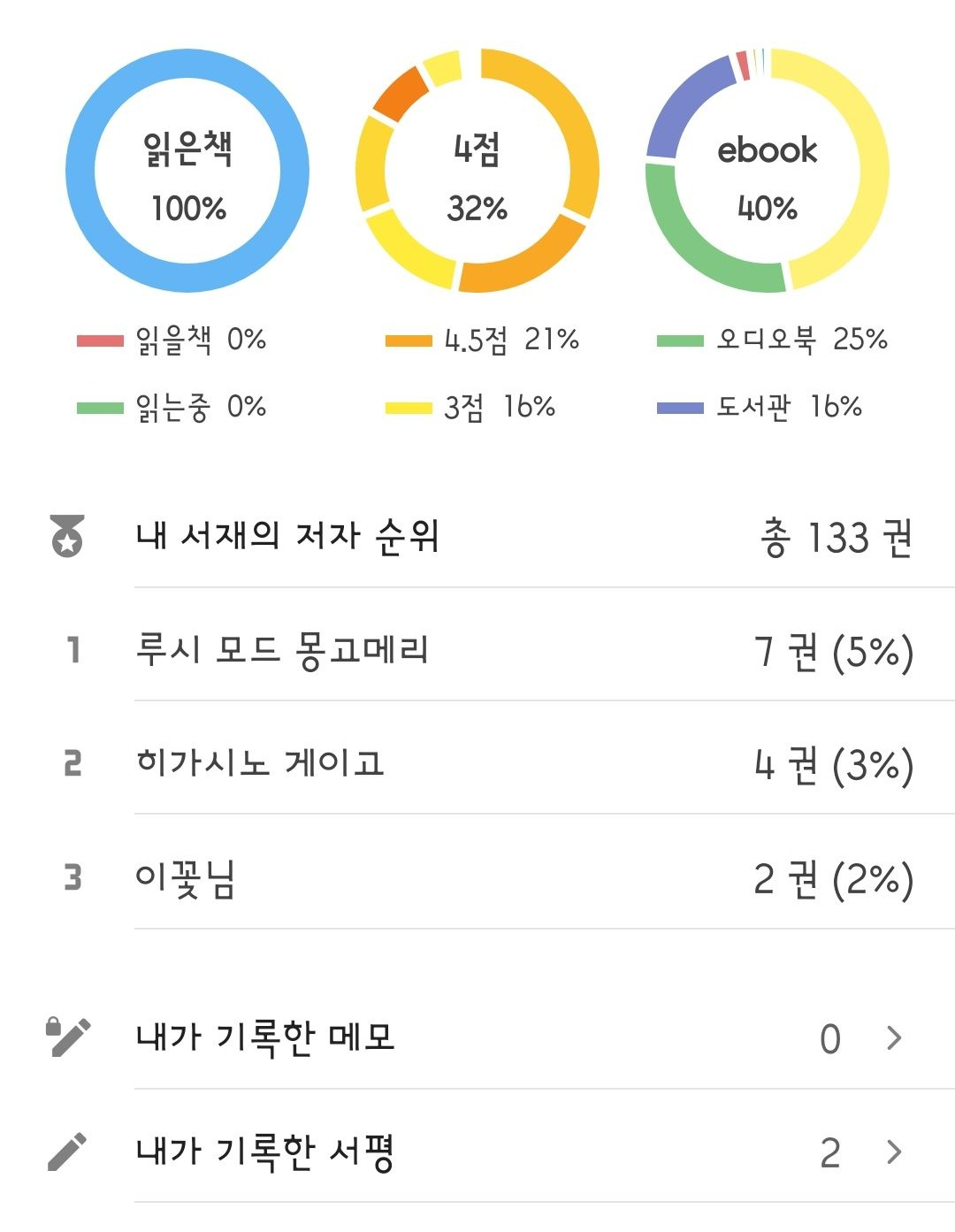 e북으로 40% 읽었고, 그다음은 25% 오디오북입니다. 종이책은 대부분 도서관이나 서평으로 이뤄져 있고요. 저자 순위도 나오는데요. 벽돌책 빨간머리앤을 8권 중에 7권을 읽어서 루시 모드 몽고메리가 1등이고요. 히가시노 게이고는 오디오북으로 들었어요. 이꽃님님 책도 2권으로 3등이네요.