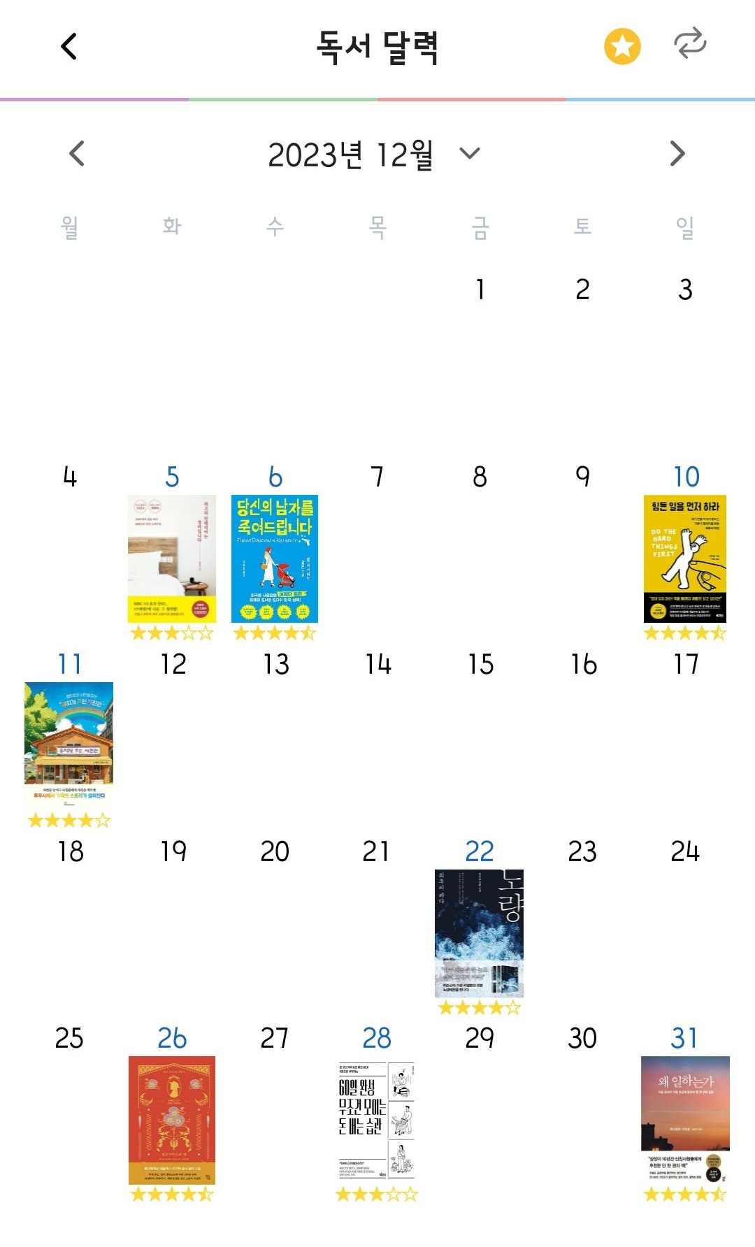 독서 차트를 통해서 월별 읽은 권수도 확인할 수 있습니다. 2023년에는 한 달에 평균 10.9권을 읽었더라고요. 올해도 비슷하게 목표 세웠는데 최소 8권은 읽는 걸로 목표 세우겠습니다!! 독서 달력 활용은 완독 후 기록합니다. 별점도 꼭 넣고 있어요. 간혹 하루에 2권 완독 하는 날은 비어있는 날짜에 옮겨서 하루 1권으로 정리해요. 2권 이상 등록하면 책 표지가 작아져서 안 예쁘게 보이더라고요.