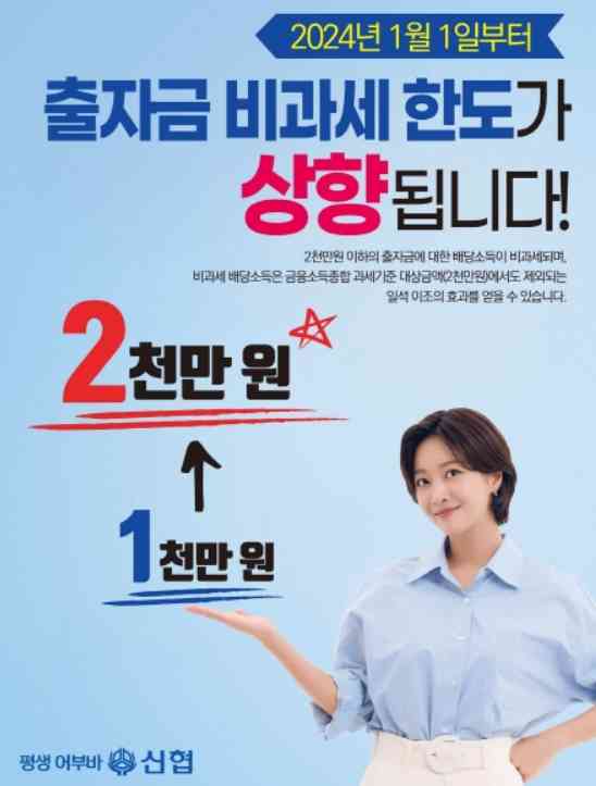 그동안 1인당 1,000만 원 한도로 넣을 수 있었던 출자금 한도가 2,000만 원으로 상향되었습니다. 출자금통장은 보통 제 2금융 협동조합인 새마을금고, 신협, 농협, 수협에서 저율과세(1.4%) 혜택을 받기 위한 조합원 통장인데요. 24년 1월 1일부터 2,000만 원까지 배당에 대한 소득세가 부과하지 않습니다. 즉, 그동안 1,000만 원까지 비과세였지만 이제는 2,000만 원까지 과세 적용 안 해요.