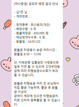 안 그래도 포스뱅크 배정 못 받았는데, 이체수수료 있는지 모르고 다른 은행 계좌로 설정했단 말이죠? 근데 환불금 타 금융사 송금처리 시간이 환불일 아침 8시 반부터 낮 12시까지라고 적혀 있어요. 그렇다면? 그전에 이미 이체하면 수수료 없이 가능하다는 말!!!! 물론 저는 하나투자증권을 사용하지 않기 때문에 잔고는 0원입니다.