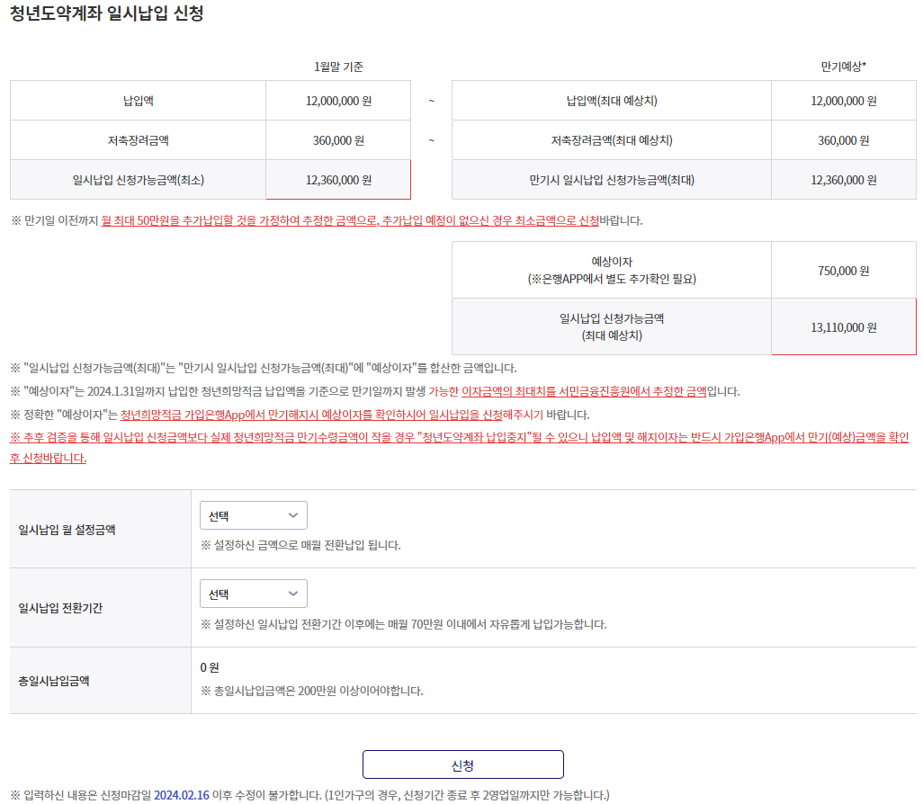 추후 일시납입 신청금액보다 실제 청년희망적금 만기수령금액이 적을 경우 "청년도약계좌 납입중지"가 될 수 있으니 반드시 가입은행 앱을 통해 만기 예상 금액 확인 후 신청해 주세요.