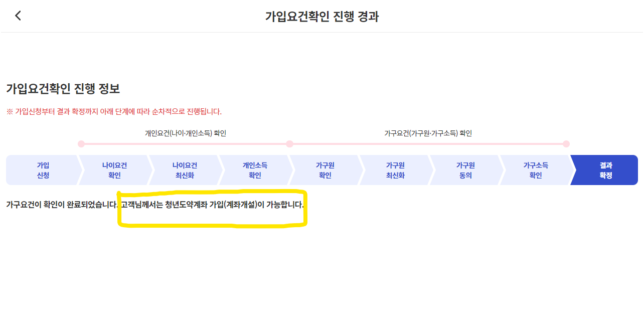 청년도약계좌 홈페이지에서 일시납입 정보 등 입력하면 며칠 뒤에 가입요건 확인 결과 통보가 되고요. 가구원 동의 완료하고 3일 뒤쯤 카카오톡 서민금융진흥원으로 일시납입 신청 톡이 옵니다. 이때 한 번 더 체크해서 계좌개설 가능 여부를 안내해준다고 하네요. 가입 요건 확인 결과에 따라 계좌개설이 제한될 수 있습니다.