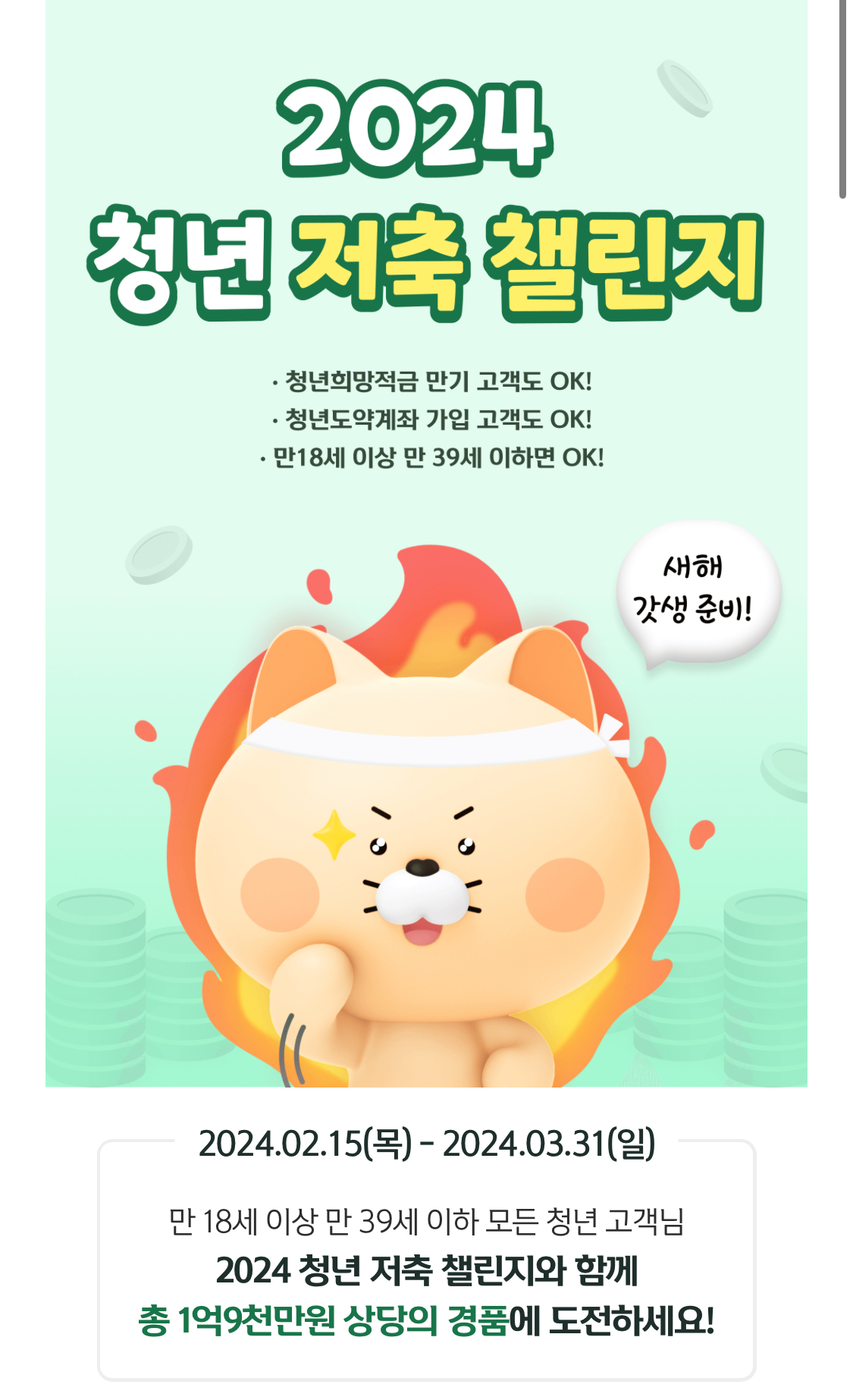 만 18세 이상 만 39세 이하 모든 청년이 참여할 수 있습니다. 알림 신청 기간은 19일까지입니다. 상품 가입 및 응모 기간은 2월 20일부터 3월 31일까지입니다. 저축 챌린지 상품이 2월 20일에 나와요. 2월 16일 금요일 쏠야구 퀴즈 정답이기도 하죠.