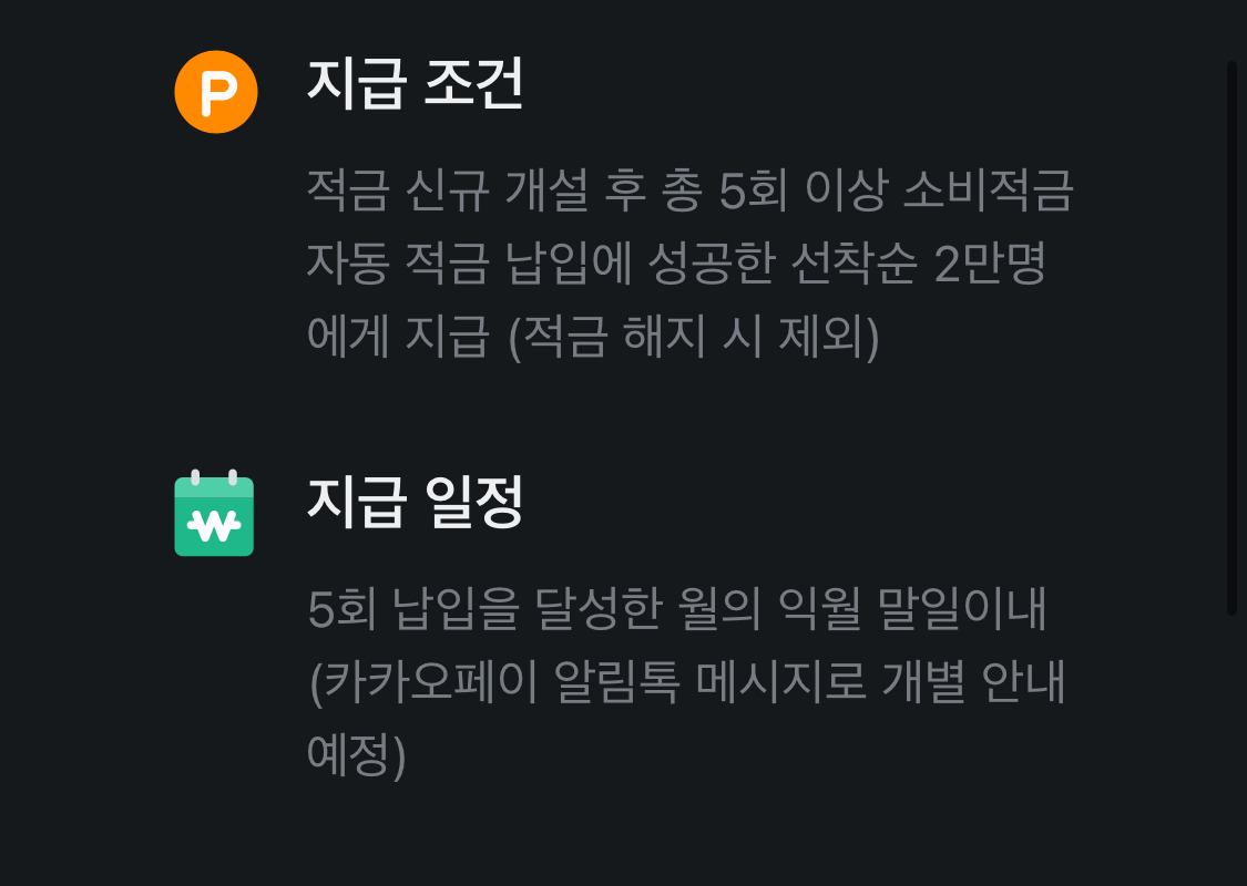 지급 일정 : 5회 납입 달성한 월의 다음 달 말일 이내 (카카오페이 알림톡 메시지로 개별 안내 예정)