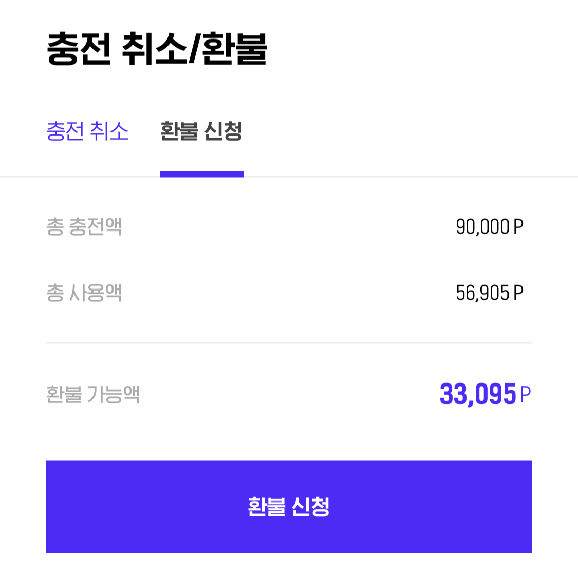 충전 포인트를 현대계열에서 사용해도 되지만 저는 환불 신청으로 추가 혜택을 노립니다. 포인트 충전 금액 60% 이상 사용하면 남은 잔액을 계좌로 환불 받을 수 있거든요! 잔액이 1만 포인트 이하라면 80% 이상 사용해야 하고요. 환불 신청은 월 3회, 매일 1일 갱신됩니다. 제휴포인트나 제휴상품권으로 충전된 포인트는 취소 및 환불 불가해요.