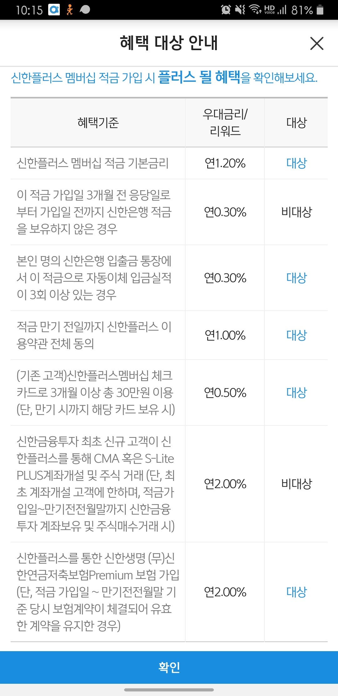 - 신한플러스 멤버십 적금 가입 전 3개월간 신한은행 적금 미보유 고객이면 연 0.3% 우대금리 제공 / 단, 가입일 3개월 전부터~가입일 전일까지 미보유