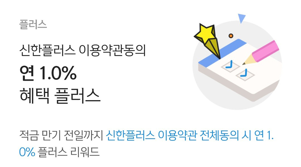 적금 만기 전일까지 신한플러스 이용약관 전체동의하면 연 1.0% 플러스 리워드