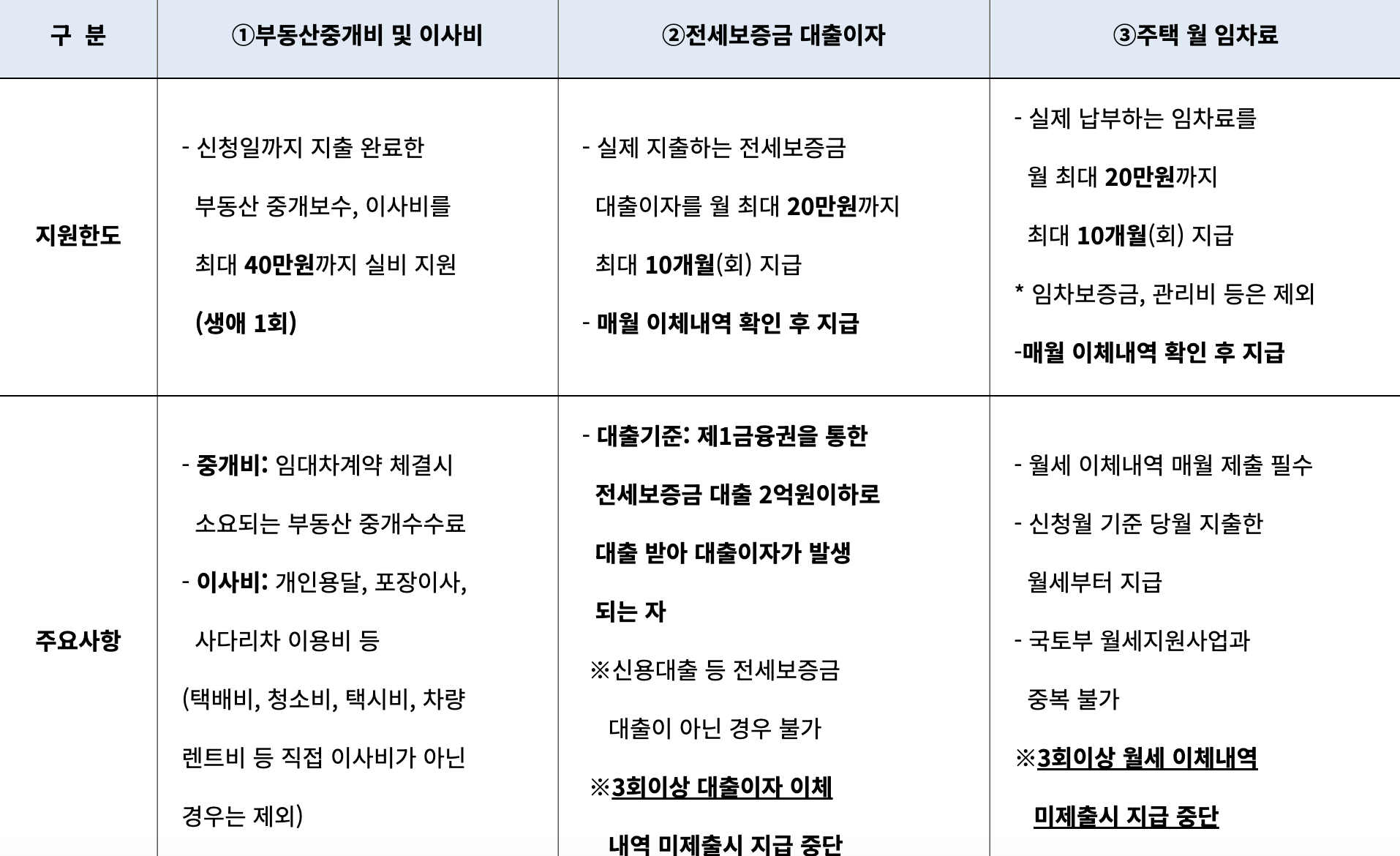 3) 주택 월 임차료 : 월 최대 20만 원까지 최대 10개월(회) 지급, 매월 이체내역 확인 후 지급합니다. 단, 임차보증금, 관리비 등은 제외!!