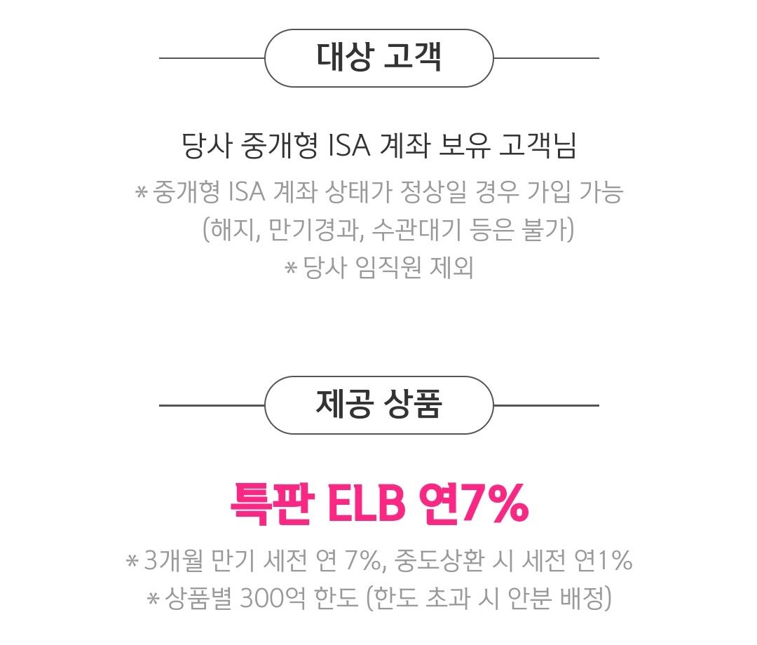 신한투자증권 중개형 ISA 계좌 소지 고객 대상으로 특판 ELB 상품 연 7% 이벤트 진행합니다. 요즘 ELB와 ELS 공부 슬슬 하고 있는데 신한투자증권에서 ELB 특판 이벤트라니 더 솔깃해요. 하지만 저는 신한투자증권 ISA계좌가 없어서 이번에는 공부할 겸 포스팅합니다.
