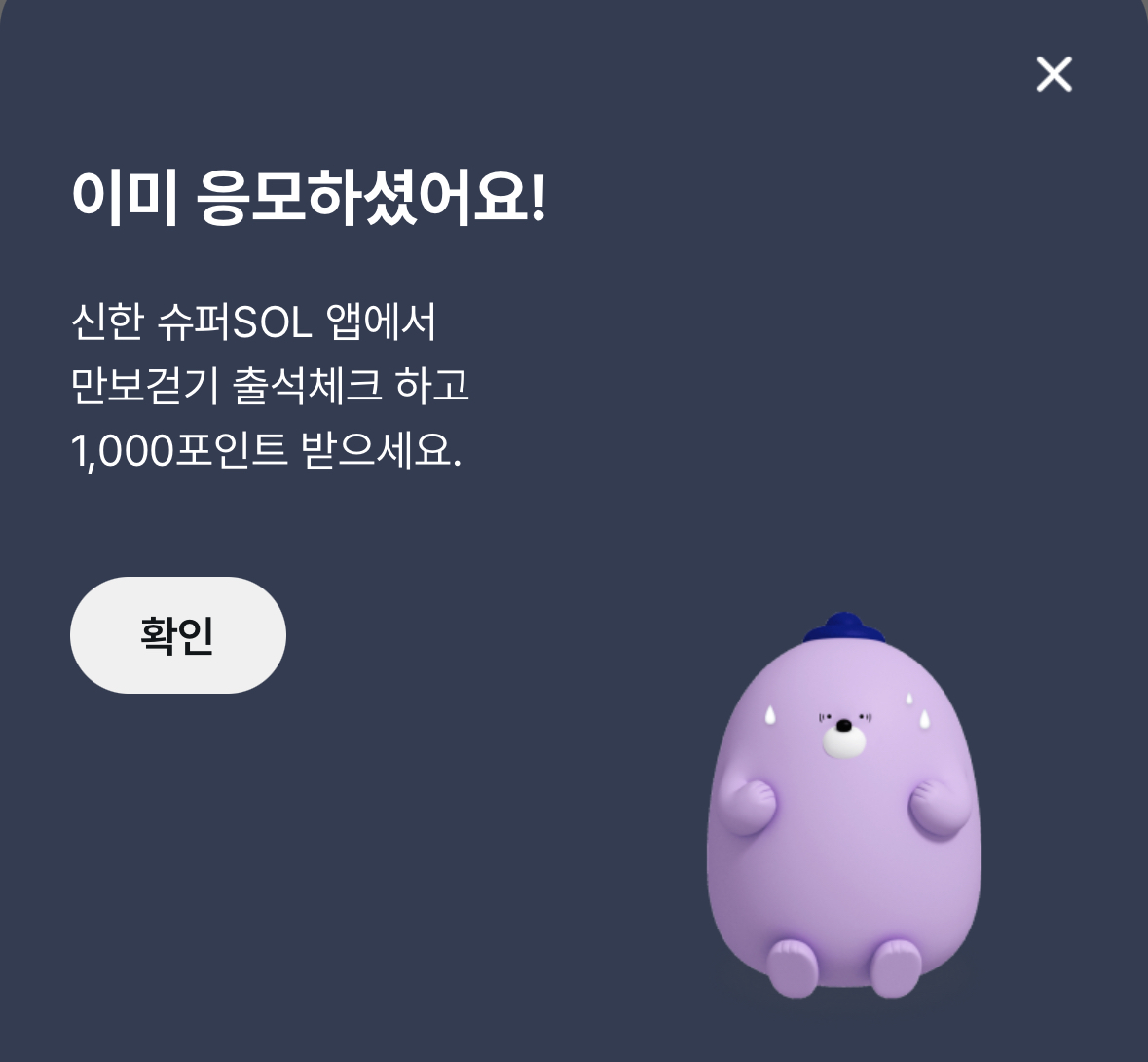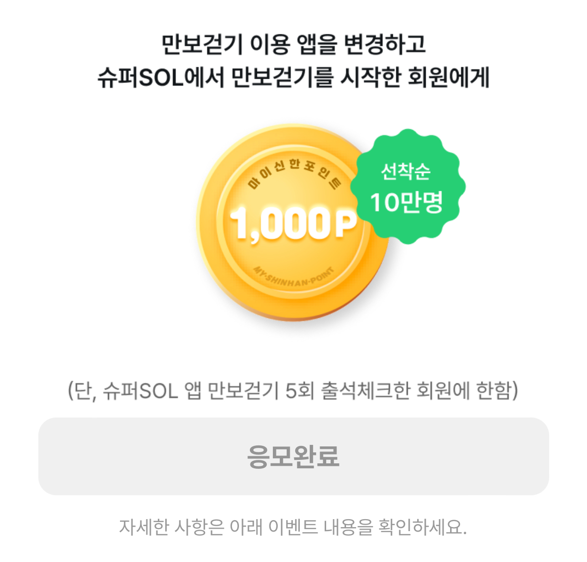 선착순 10만 명에게 1,000점 마이신한포인트 받을 수 있고요. 단, 지금 신규는 안되고 만보걷기 5회 출석한 회원에 한합니다. 오늘이 처음이라면 오늘부터 5일 채우고 이벤트 응모하세요! 그때까지 선착순 끝나지 않는다면 받을 수 있겠죠?