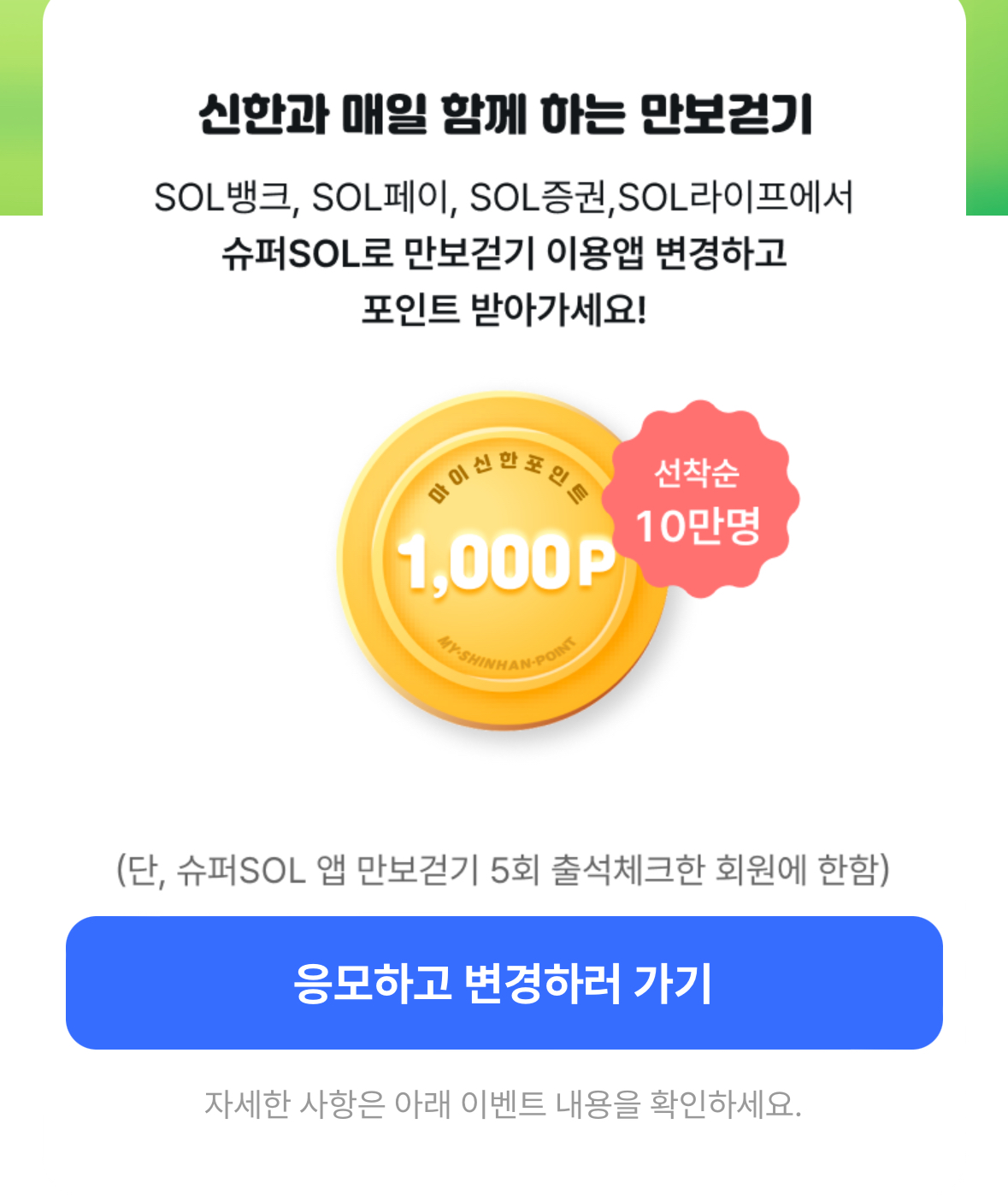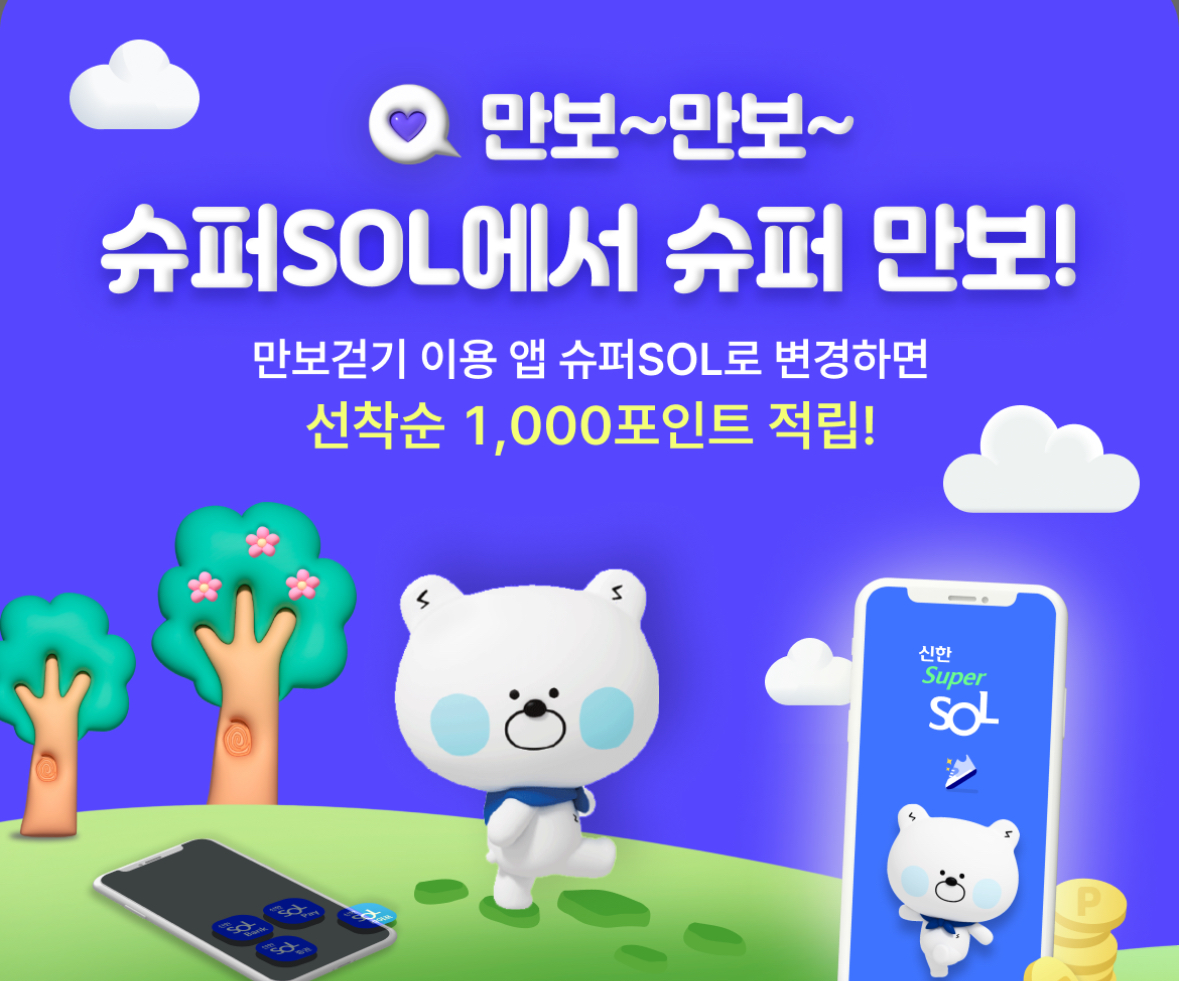 신한 슈퍼SOL에서 만보 걷기 미션을 변경하면 선착순 1,000포인트 적립 이벤트 진행하고 있습니다. 신한포인트는 1:1 비율로 현금화 가능하니까요. 안 할 이유 전혀 없습니다.