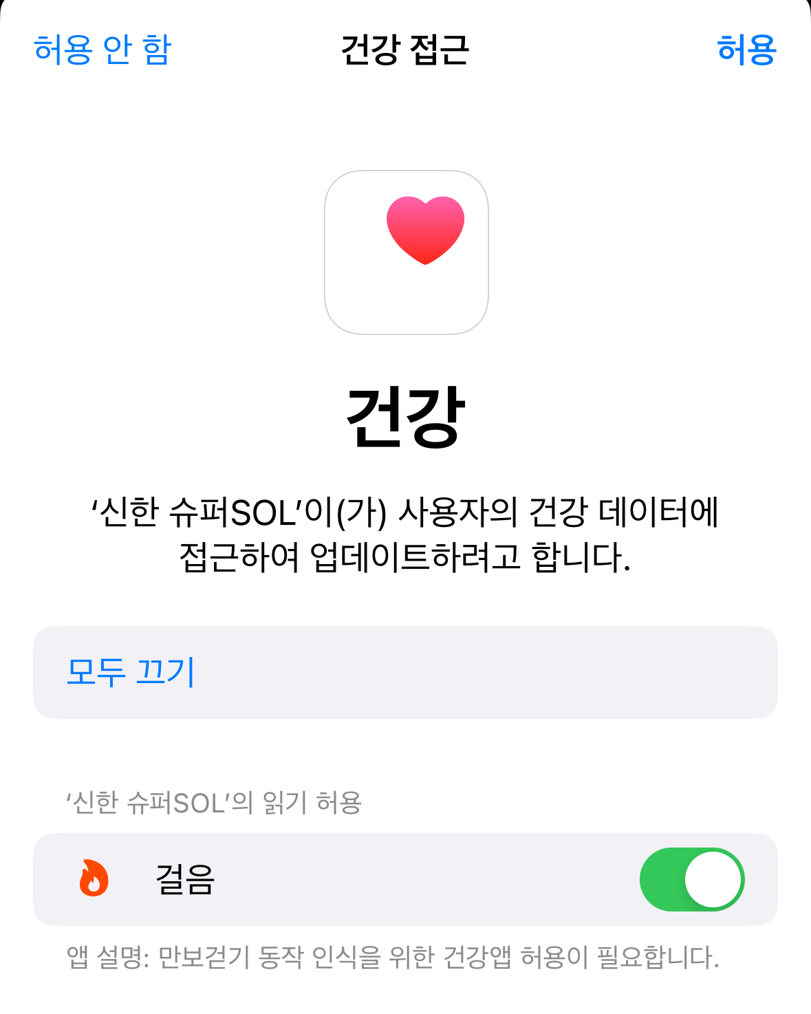 아이폰 경우 '건강' 앱에서 접근 허용 체크하는 페이지로 넘어가더라고요. 몇 번 클릭만 하면 알아서 완료됩니다.
