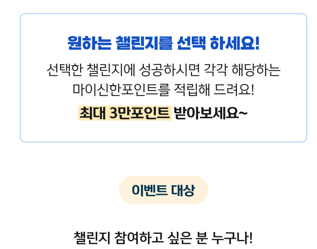 신한은행에서 금융챌린지로 최대 3만 신한포인트를 받을 수 있습니다. 신한포인트는 추후 상품 가입할 때 일부 보태서 1:1 비율로 사용할 수 있는 현금이라고 생각하면 좋습니다. 무리하게 상품 가입할 필요는 없고 할 수 있는 것에 집중하면 좋겠죠?