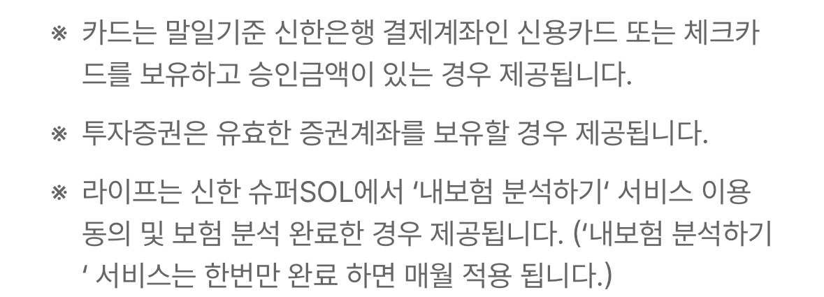 + 저는 신한생명 가입이 없어서 우대금리 못 받을 줄 알았는데, '내 보험 분석하기' 서비스 이용 및 보험 분석 완료를 한 번만 해도 매월 자동 적용이라고 합니다. 이게 어떤 활동인지는 아직 안 해봤는데요. 해 보고 괜찮은지 아닌지 추가로 남길게요. 신한투자증권은 계좌 보유하고 있으면 되고요. 카드는 말일 기준 신한은행 결제계좌인 신용카드 또는 체크카드 보유하고 승인금액이 있어야 해요. 1회 이상 결제가 되어야 적용됩니다. 저처럼 신한 쪽 많이 쓰는 사람은 유리한 구조입니다.