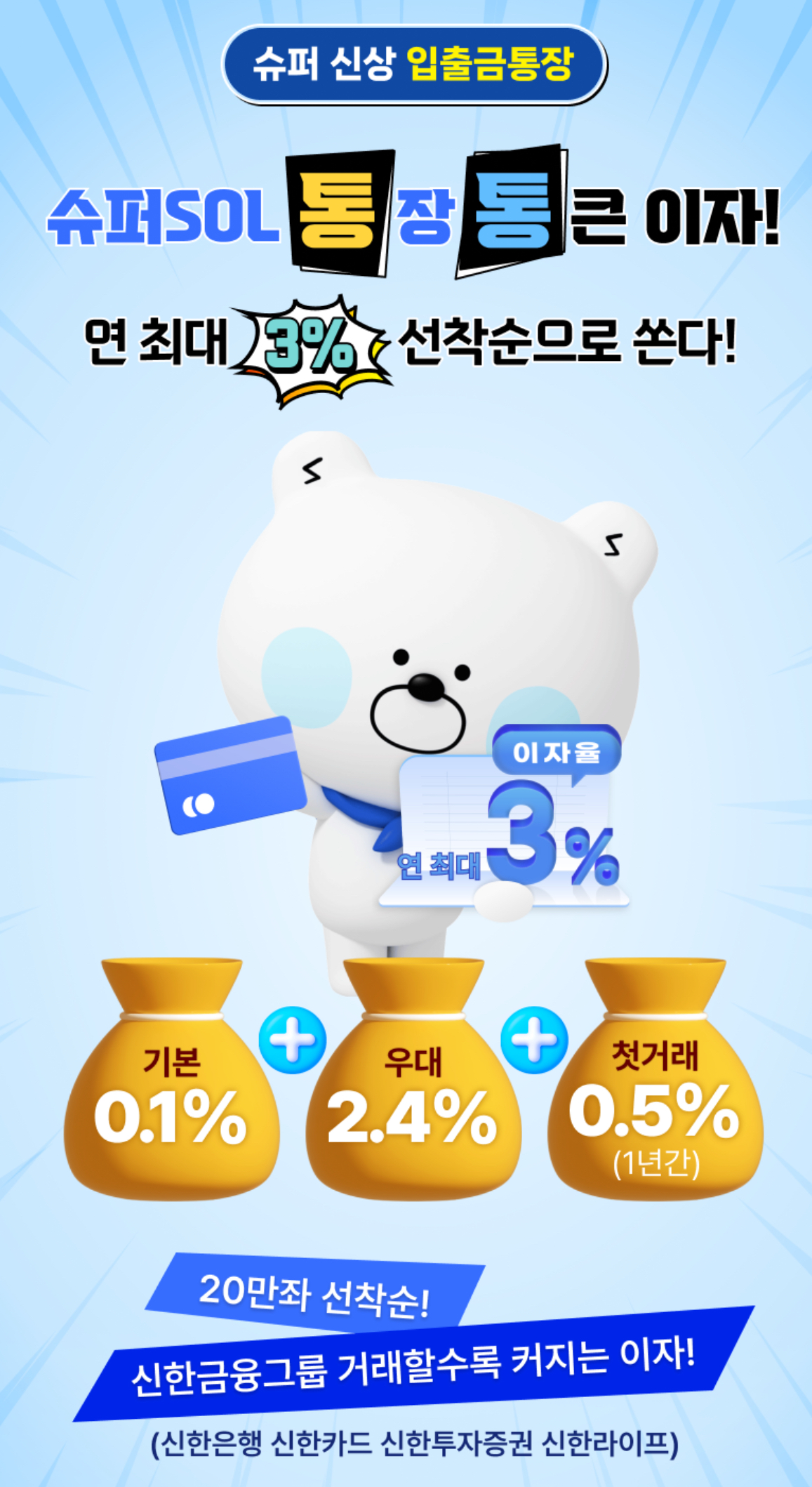 신한은행 슈퍼SOL 입출금통장이 새롭게 출시되었습니다. 기존에 잘 쓰고 있는 입출금통장이 있는데 새롭게 또 개설해야 하는 번거로움이 있지만 최고 연 3% 금리라면 또 도전해야겠죠? 입출금통장 신규 개설하면 20영업일 이후에 다른 입출금통장 만들 수 있고요. 슈퍼SOL 입출금통장은 한도제한 걸린 상태로 개설되는 통장입니다.