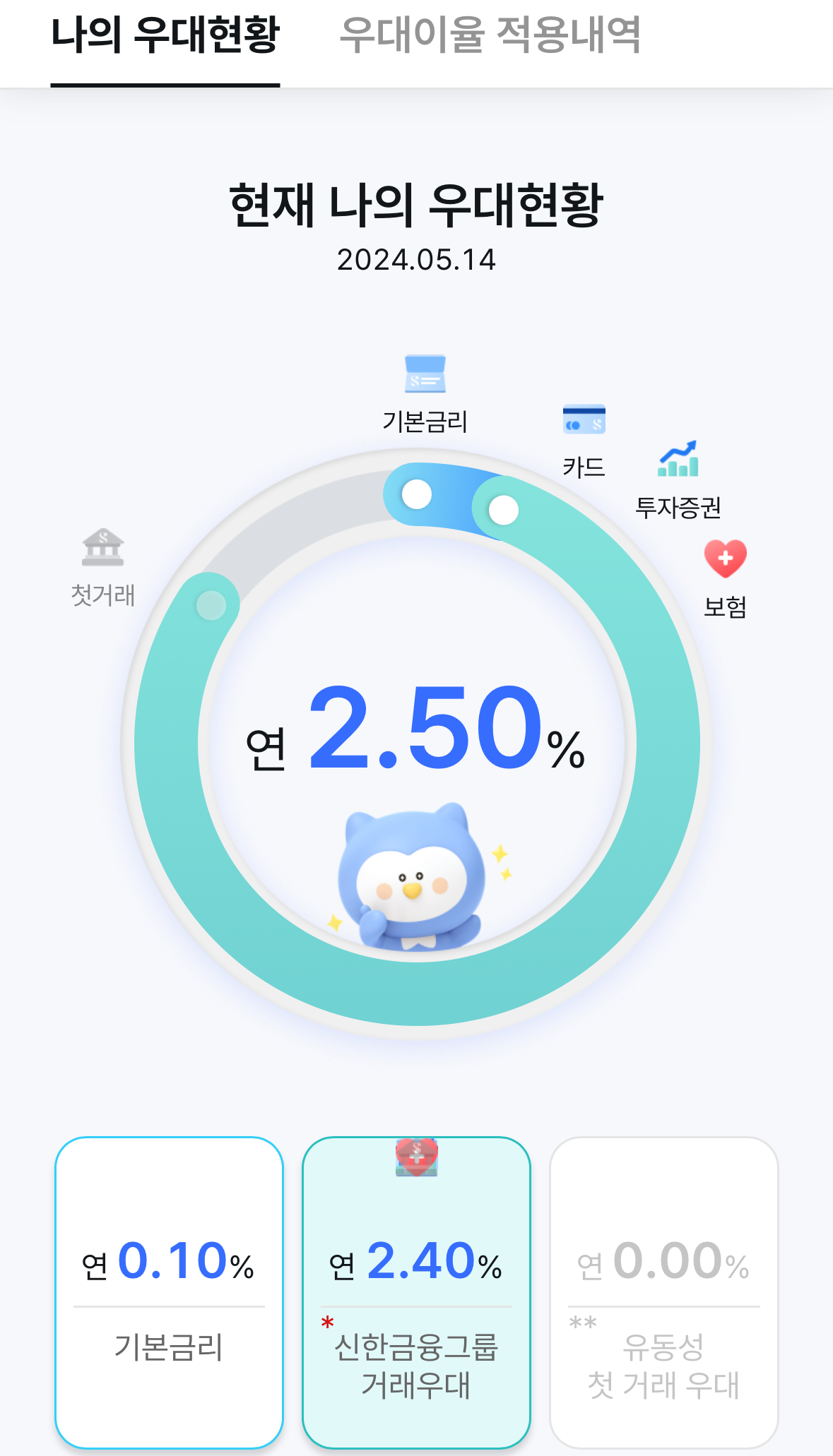 가입하고 한 달은 신한금융그룹 우대금리 최고인 연 2.4%로 적용된다고 합니다. 잊지 말고 보험 분석하는 것도 완료해야겠어요!