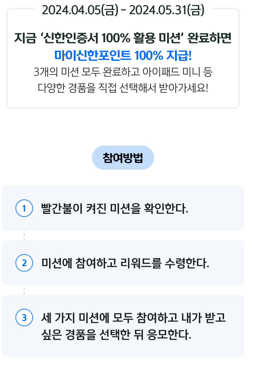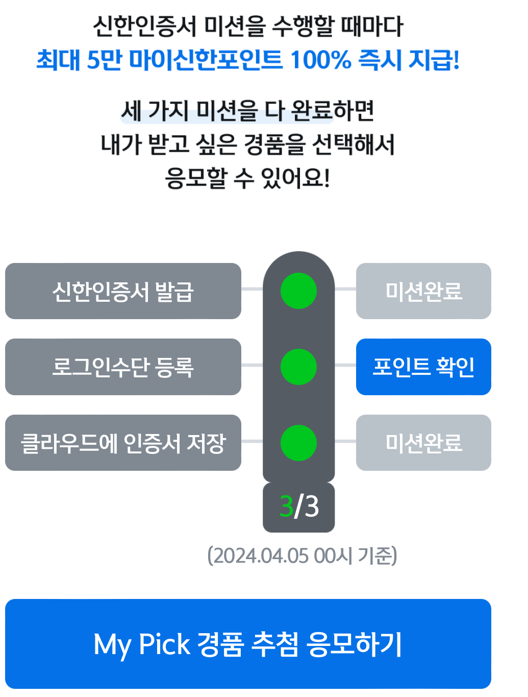 신한인증서 100% 활용 미션 완료하면 마이신한포인트 100% 지급합니다. 간단한 이벤트인데 신한포인트 주는 건 참여해야죠!! 마이신한포인트는 1:1 비율로 현금화 가능합니다.