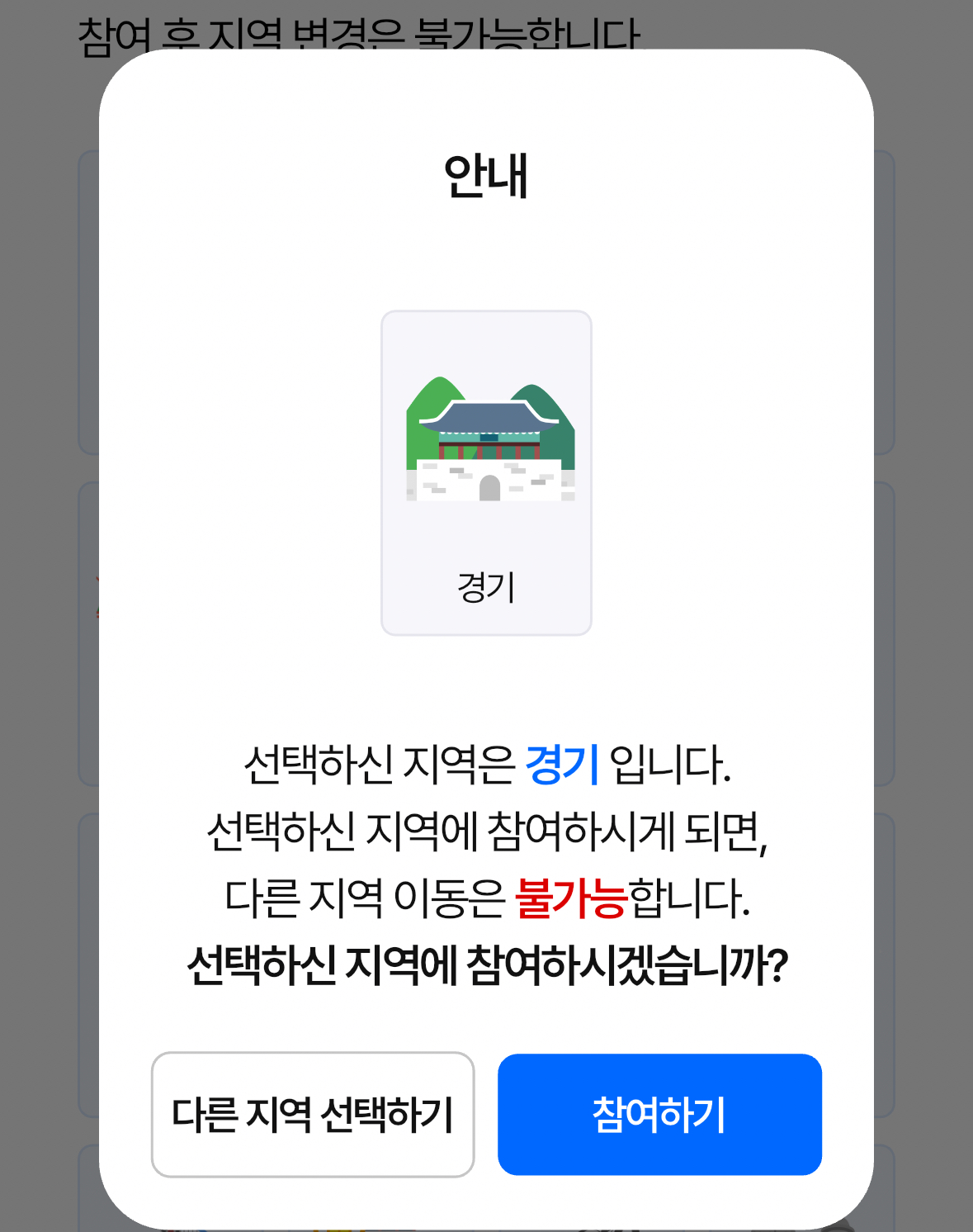 지역 선택은 한 번 정하면 변경 불가능합니다.