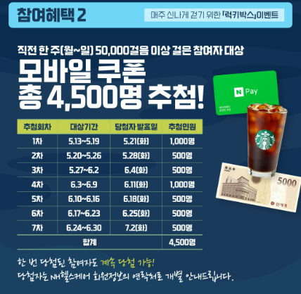 직전 한 주(월~일) 5만 걸음 이상 걸은 참여자 대상으로 모바일쿠폰 5천 원 상당 쏩니다. 아직 1차 시작 전이라서 빨리 시작하면 7번 추첨 기회가 있고요. 한 번 당첨되어도 계속 당첨 가능합니다. 1주차는 스타벅스 아메리카노 1,000명입니다. 아마 수량 보면 1,000은 스타벅스 아메리카노, 그 외 500명은 신세계 상품권이나 N페이 5,000원일 것 같네요.
