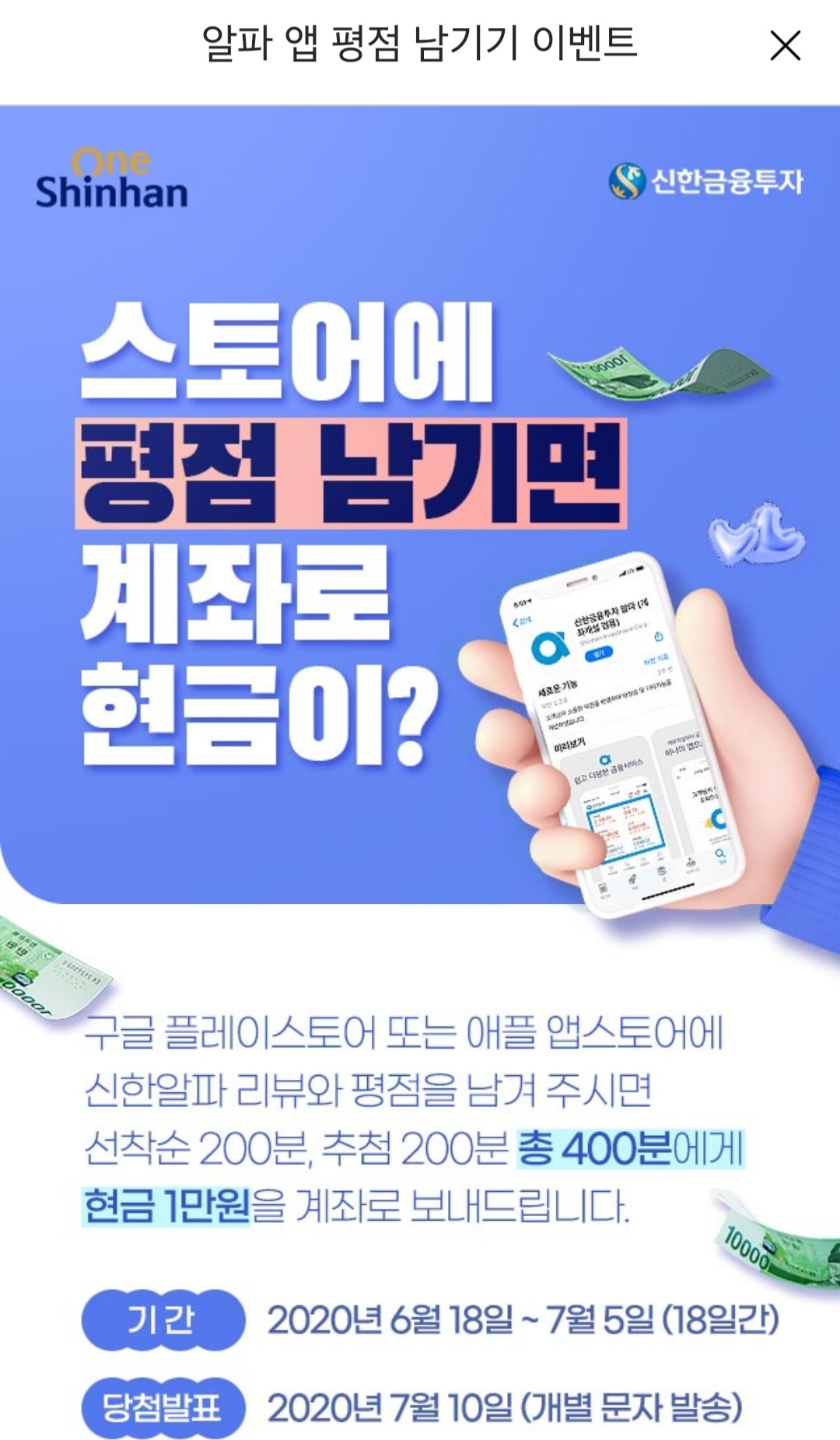 요즘 제가 사용하고 있는 증권사 어플은 신한금융투자인데요. 신한알파 리뷰와 평점 남기면 선착순 200명, 추첨 200명 총 400명에게 현금 1만 원을 계좌로 보내는 이벤트 하고 있어요.