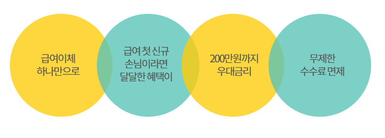 - 급여이체 : 건당 50만 원 이상 입금 시 해당 단어 (급여, 월급, 봉급, 상여, SALARY, BONUS 등) 포함하여 입금되거나 사전 등록한 급여지정일 전후 1영업일 이내 입금되는 월의 다음 달에 제공 (단, 타인으로부터 이 통장에 입금된 건에 한함)