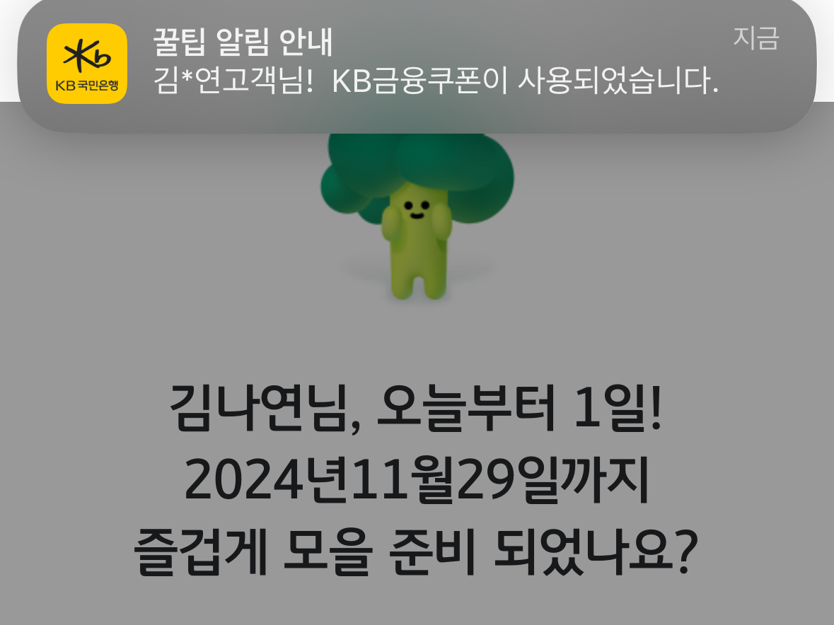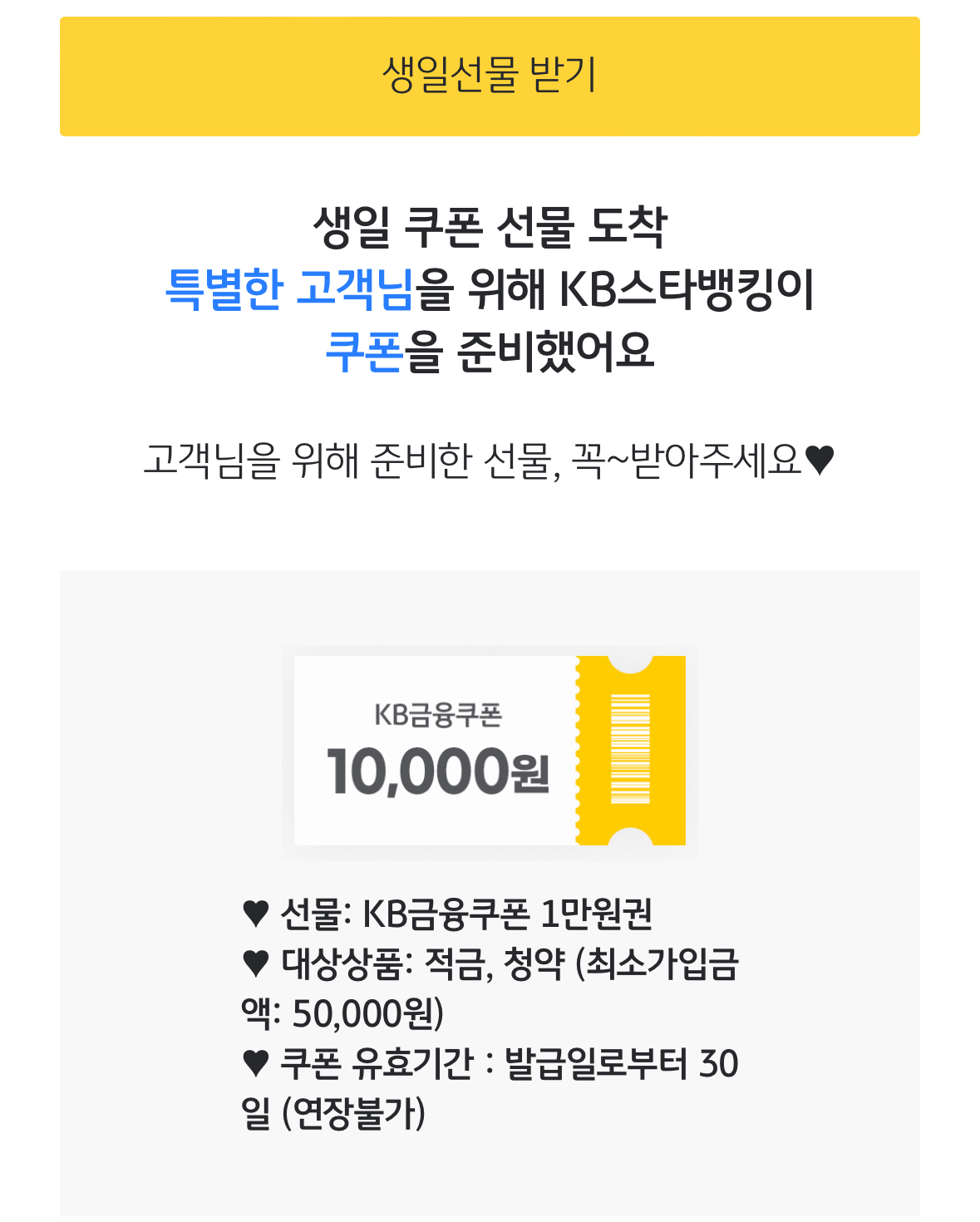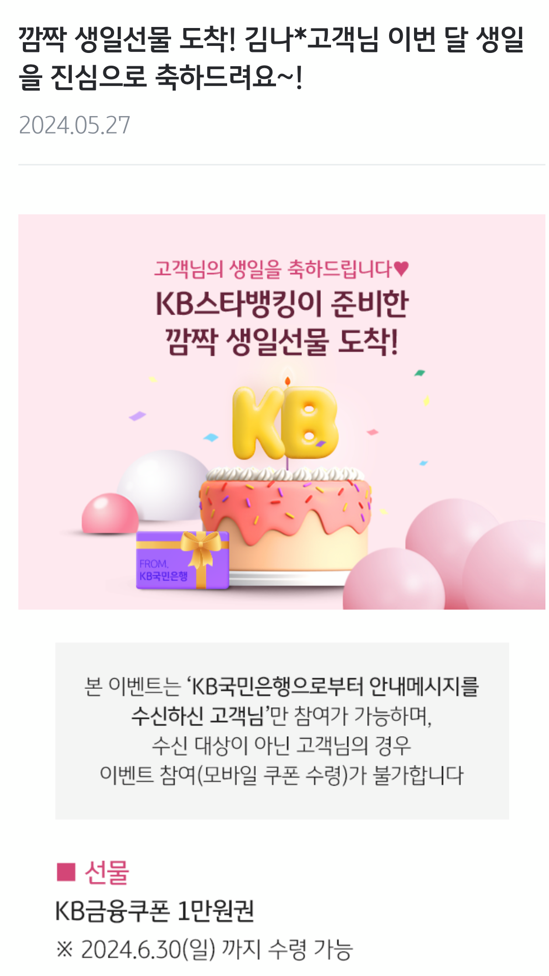 KB국민은행으로부터 안내메시지를 수신하신 고객님만 참여 가능한 이벤트입니다. 5월 생일이면 6월 30일까지 수령 가능하더라고요. 해당 쿠폰은 선물하기도 가능하니까 주변에 생일인데 사용하지 않는 쿠폰 있다면 받아도 될 듯합니다.